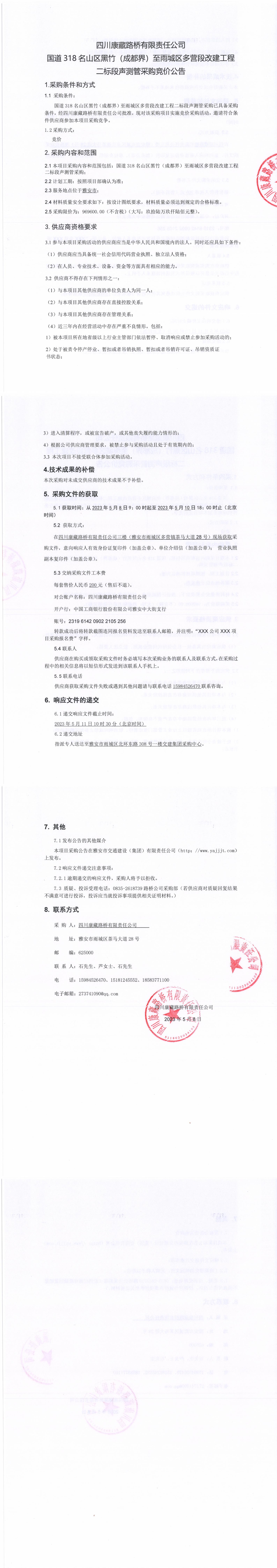 四川康藏路橋有限責(zé)任公司國道318名山區(qū)黑竹(成都界)至雨城區(qū)多營段改建工程二標(biāo)段聲測(cè)管采購競(jìng)價(jià)公告