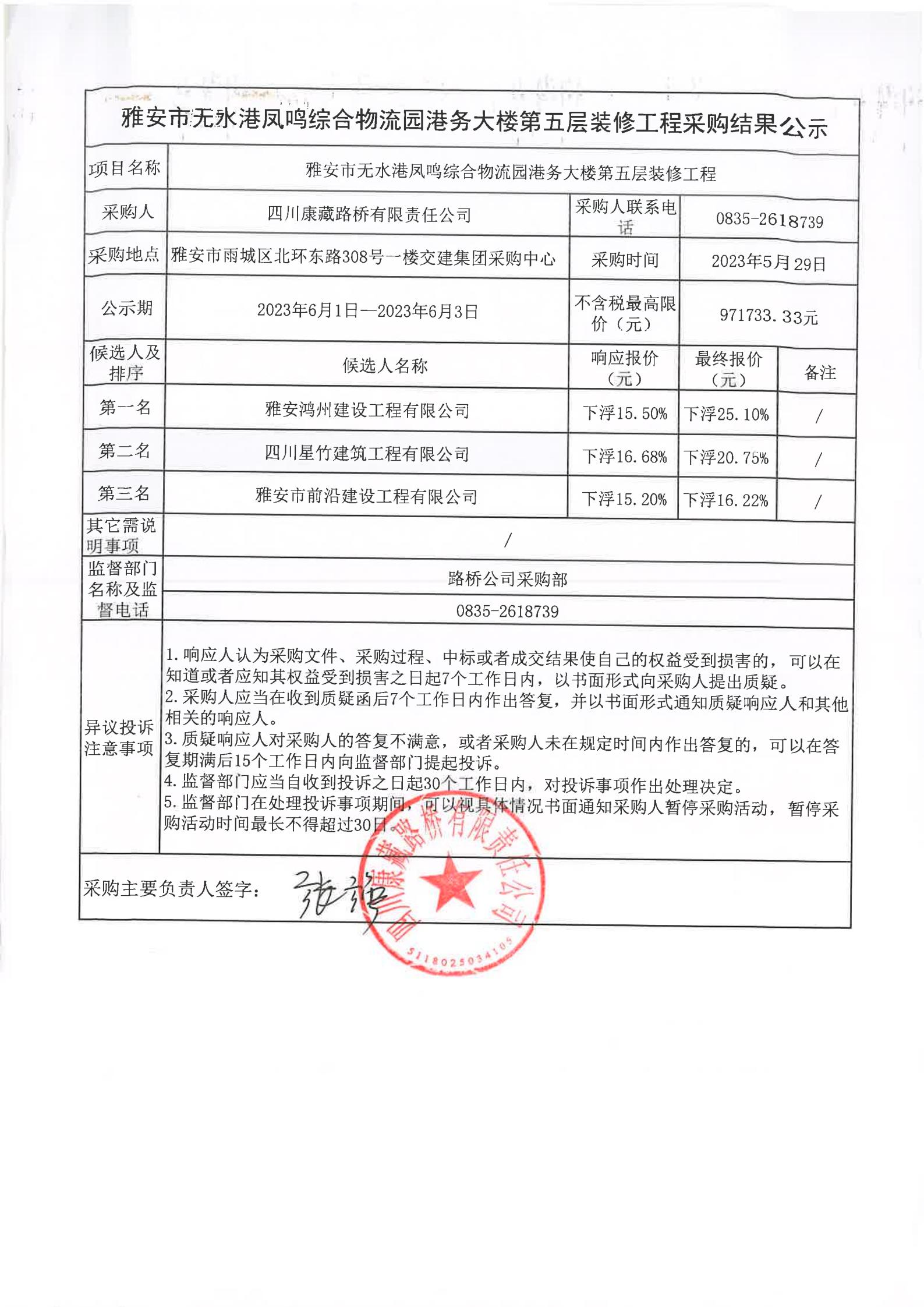 四川康藏路橋有限責(zé)任公司雅安市無(wú)水港鳳鳴綜合物流園港務(wù)大樓第五層裝修工程采購(gòu)結(jié)果公示