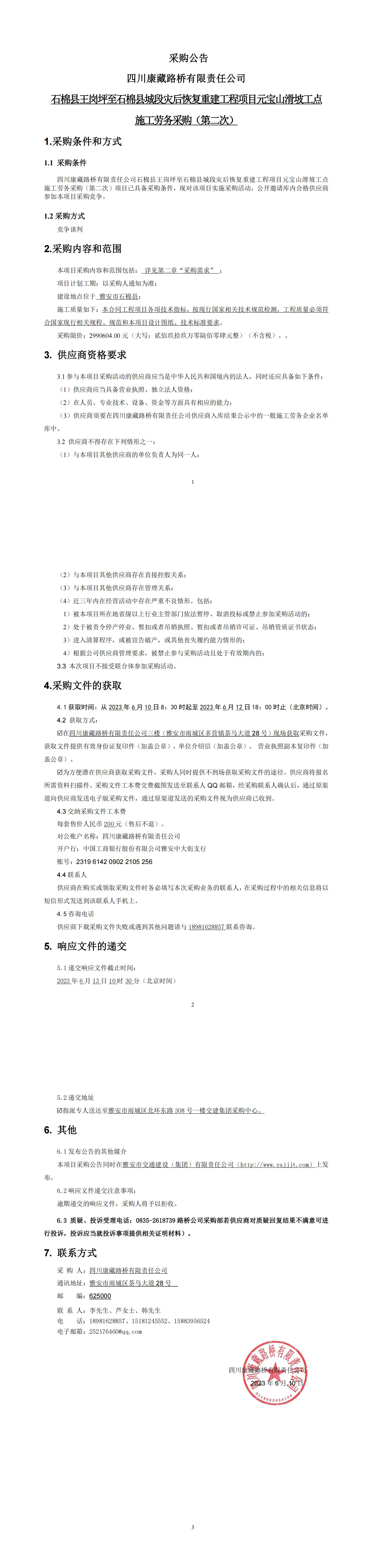 四川康藏路橋有限責(zé)任公司“9·5”瀘定地震石棉縣農(nóng)村公路災(zāi)后恢復(fù)重建工程項目混凝土路面工程施工勞務(wù)采購(第二次)庫內(nèi)競價公告