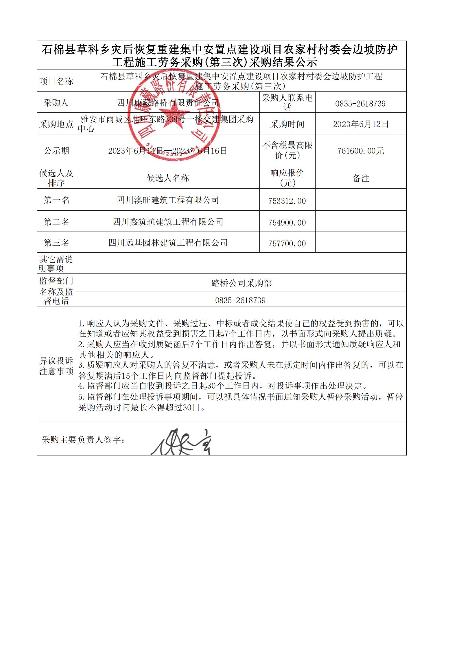 四川康藏路橋有限責(zé)任公司石棉縣草科鄉(xiāng)災(zāi)后恢復(fù)重建集中安置點建設(shè)項目農(nóng)家村村委會邊坡防護(hù)工程施工勞務(wù)采購(第三次)結(jié)果公示