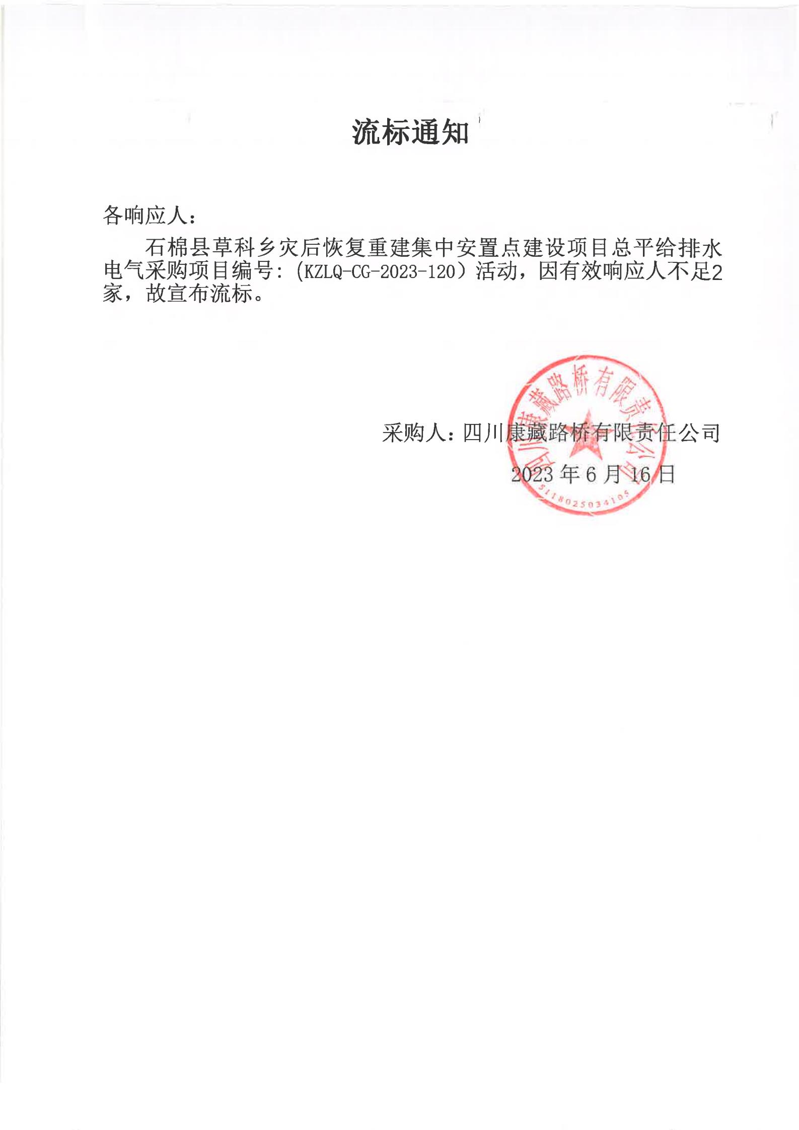 四川康藏路橋有限責任公司石棉縣草科鄉(xiāng)災后恢復重建集中安置點建設(shè)項目總平給排水電氣采購流標通知