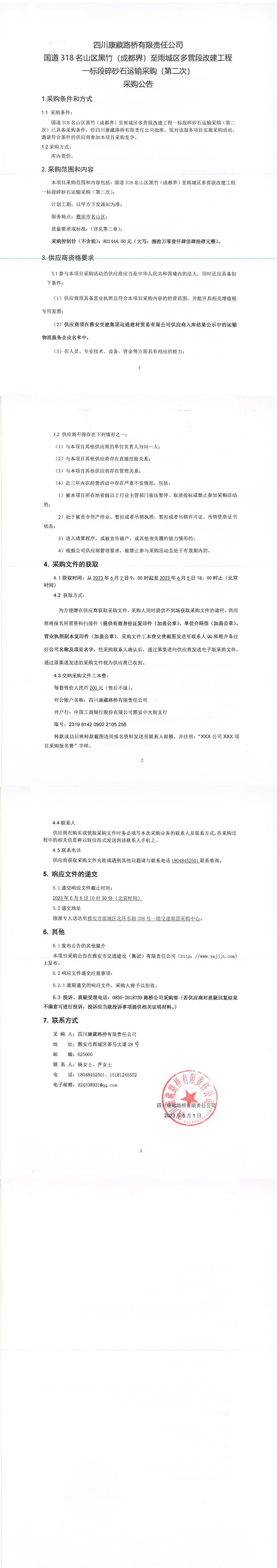 四川康藏路橋有限責任公司國道318名山區(qū)黑竹(成都界)至雨城區(qū)多營段改建工程一標段碎砂石運輸采購(第二次)采購公告