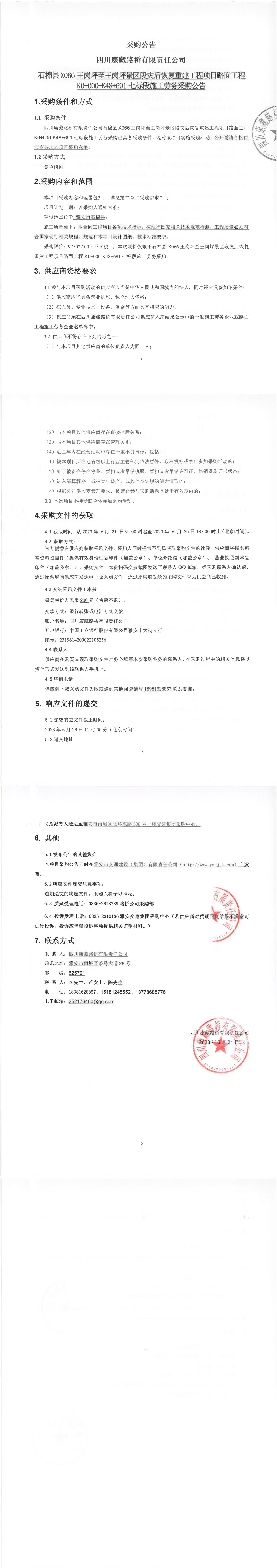 四川康藏路橋有限責任公司石棉縣X066王崗坪至王崗坪景區(qū)段災后恢復重建工程項目路面工程K0+000-K48+691七標段施工勞務采購公告