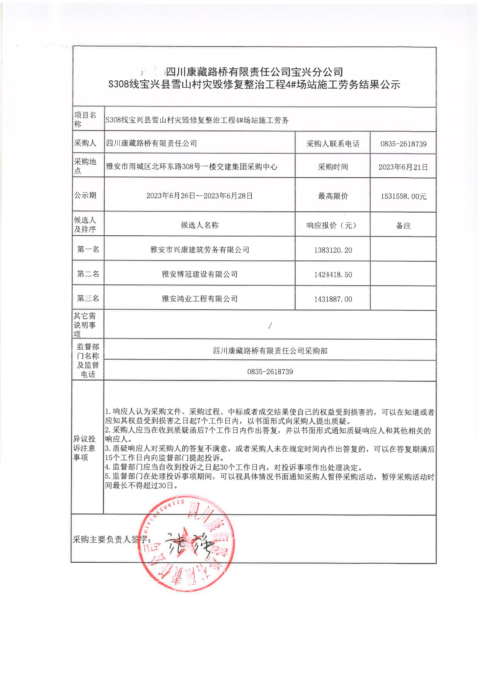 四川康藏路橋有限責任公司寶興分公司S308線寶興縣雪山村段災毀修復整治工程4#場站施工勞務結果公示