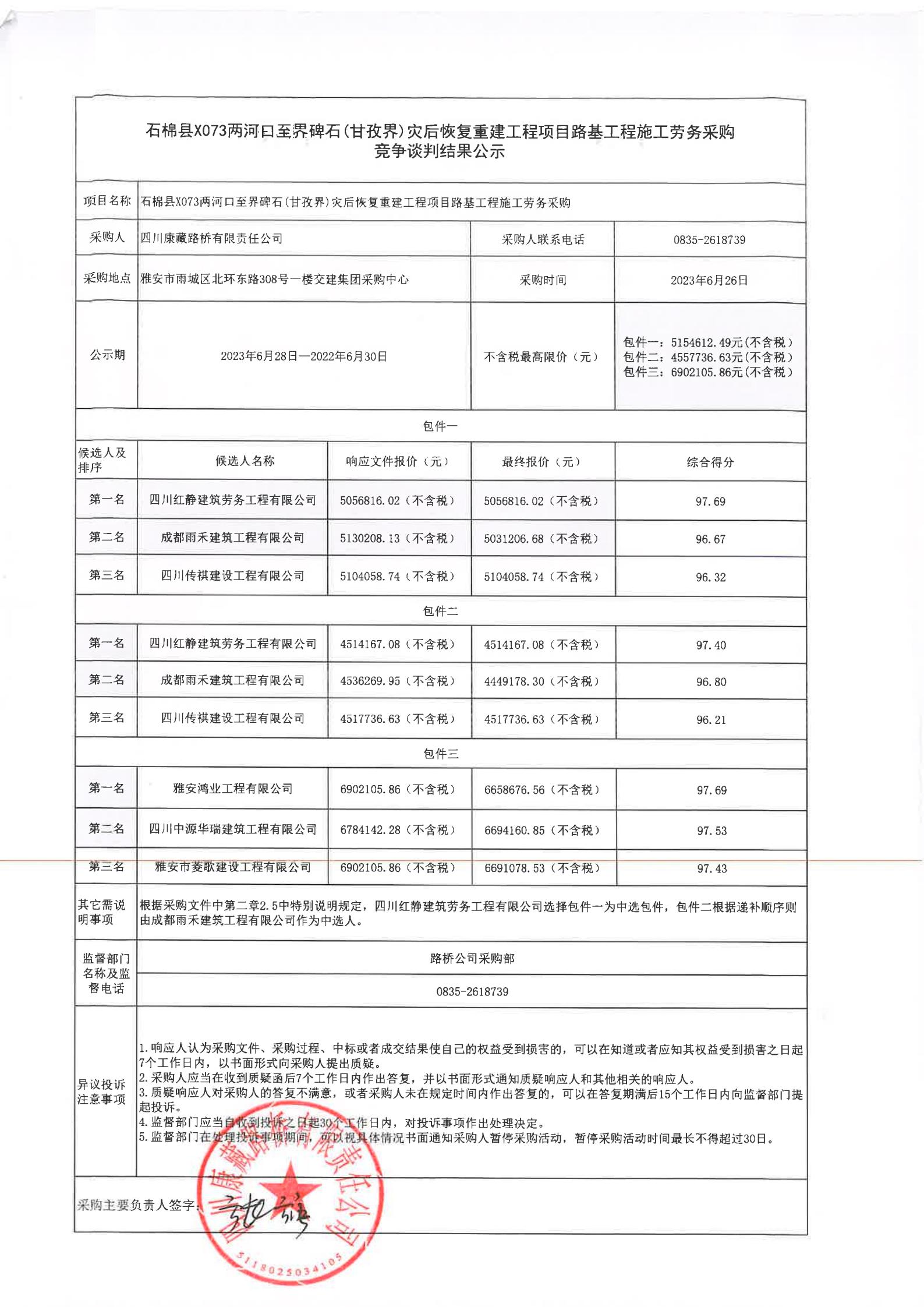 四川康藏路橋有限責(zé)任公司石棉縣X073兩河口至界碑石(甘孜界)災(zāi)后恢復(fù)重建工程項(xiàng)目路基工程施工勞務(wù)采購(gòu)競(jìng)爭(zhēng)談判結(jié)果公示