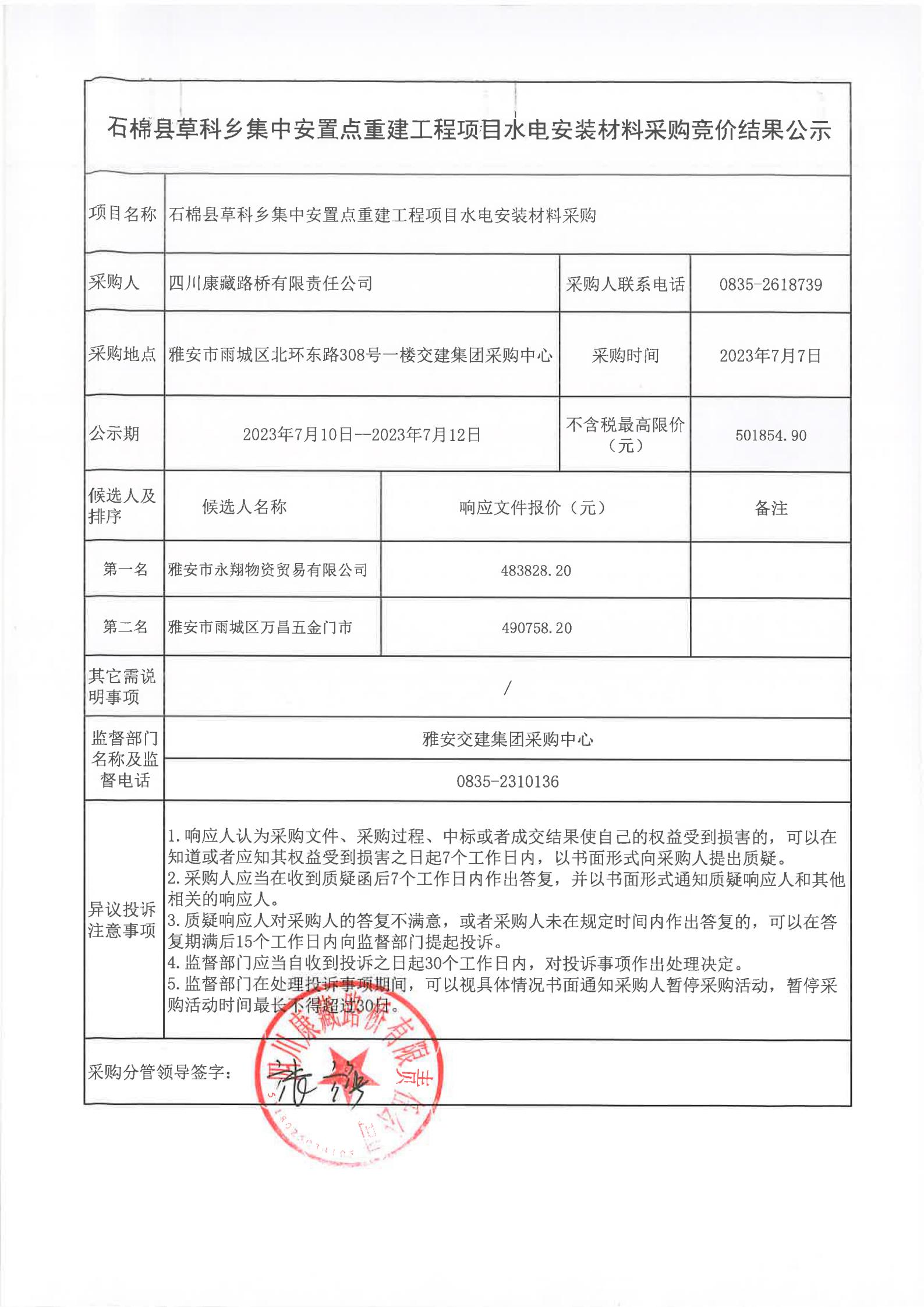 四川康藏路橋有限責(zé)任公司石棉草科鄉(xiāng)集中安置點(diǎn)重建工程項目水電安裝材料采購競價結(jié)果公示