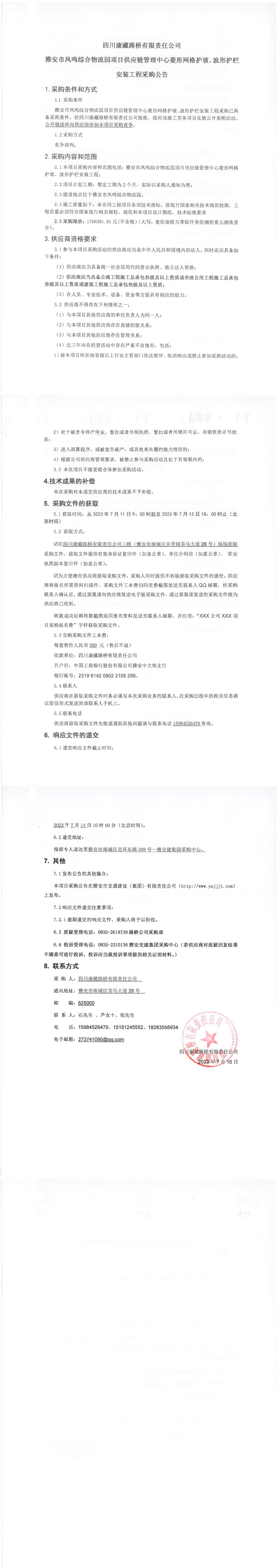 四川康藏路橋有限責任公司雅安市鳳鳴綜合物流園項目供應鏈管理中心菱形網(wǎng)格護坡、波形護欄安裝工程采購公告