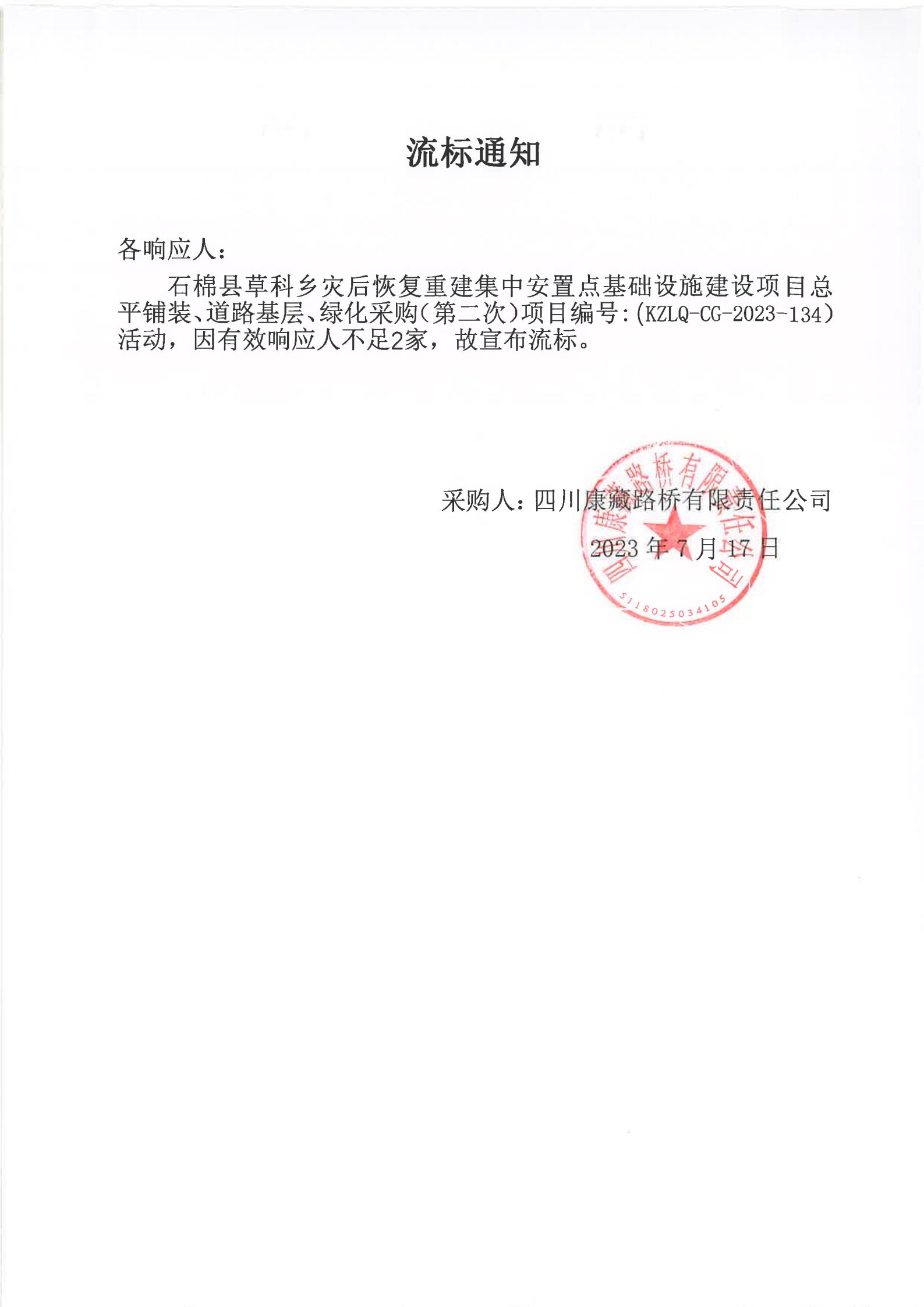 四川康藏路橋有限責任公司石棉縣草科鄉(xiāng)災后恢復重建集中安置點基礎(chǔ)設(shè)施建設(shè)項目總平鋪裝、道路基層、綠化采購(第二次)流標通知