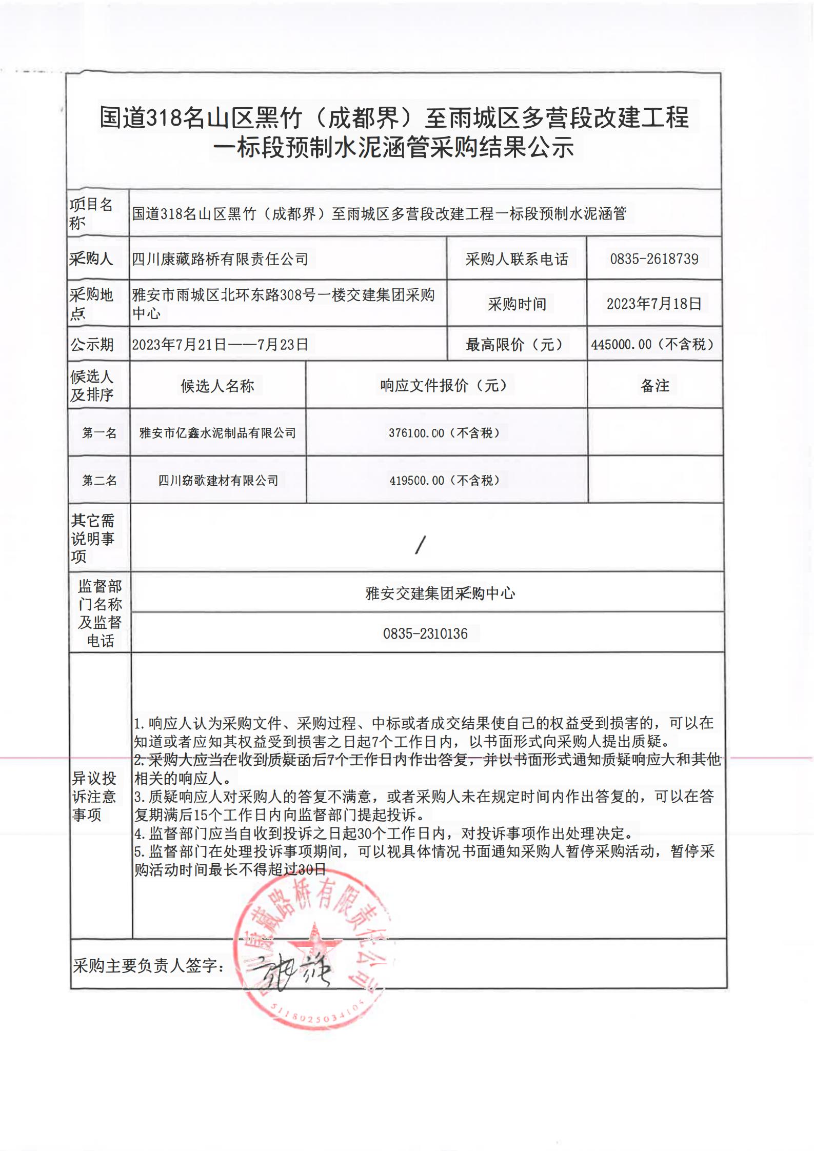 四川康藏路橋有限責任公司國道318名山區(qū)黑竹(成都界)至雨城區(qū)多營段改建工程一標段預制水泥涵管采購結(jié)果公示