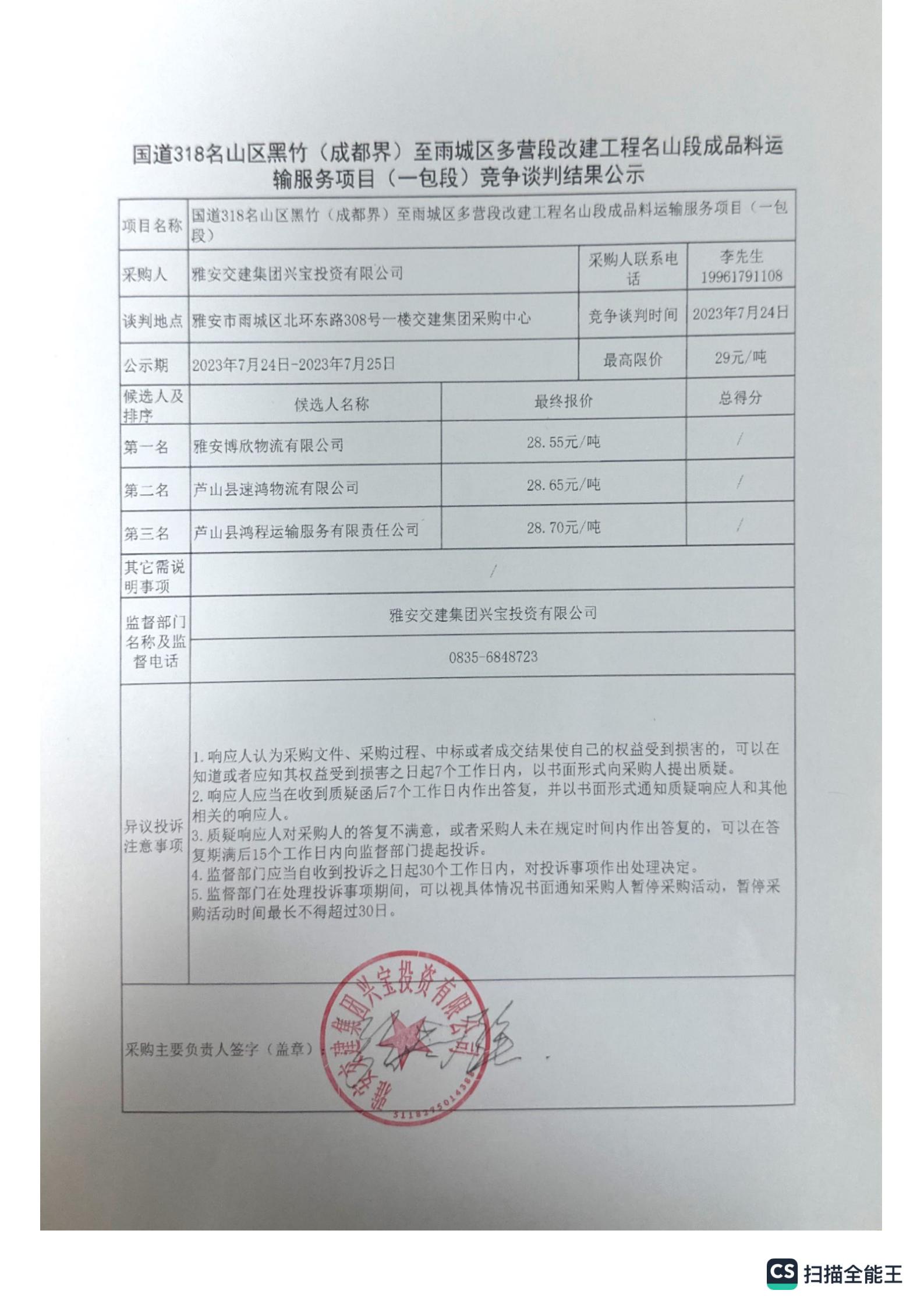雅安交建集團興寶投資有限公司國道318名山區(qū)黑竹(成都界)至雨城區(qū)多營段改建工程名山段成品料運輸服務項目(二包段)競爭談判結果公示