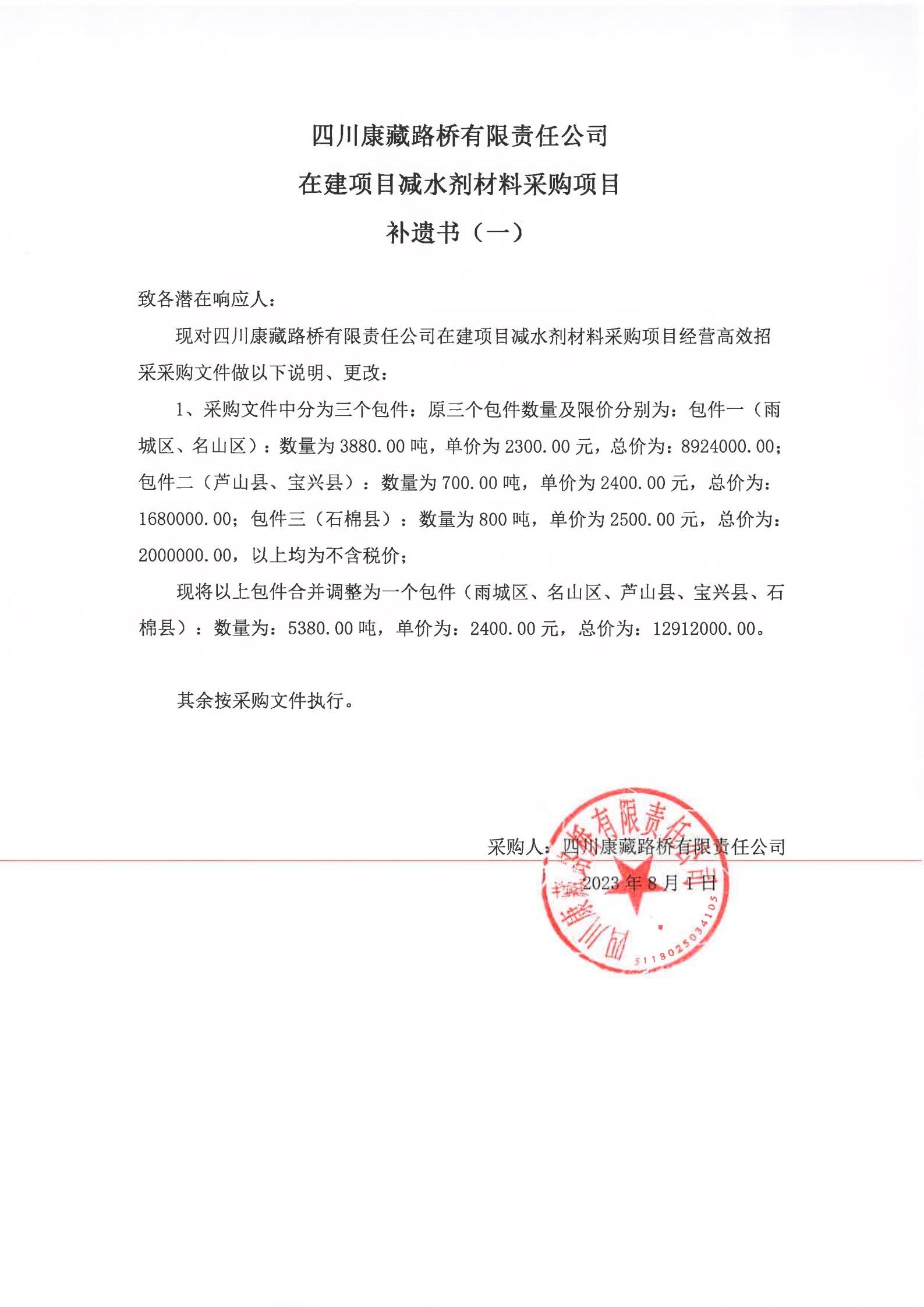 四川康藏路橋有限責(zé)任公司在建項(xiàng)目減水劑材料采購項(xiàng)目補(bǔ)遺書(一)