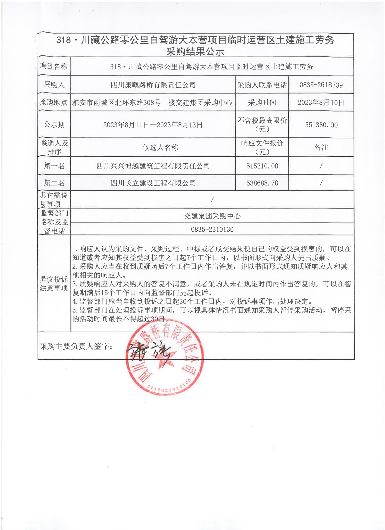 四川康藏路橋有限責(zé)任公司318·川藏公路零公里自駕游大本營項目臨時運營區(qū)土建施工勞務(wù)采購結(jié)果公示