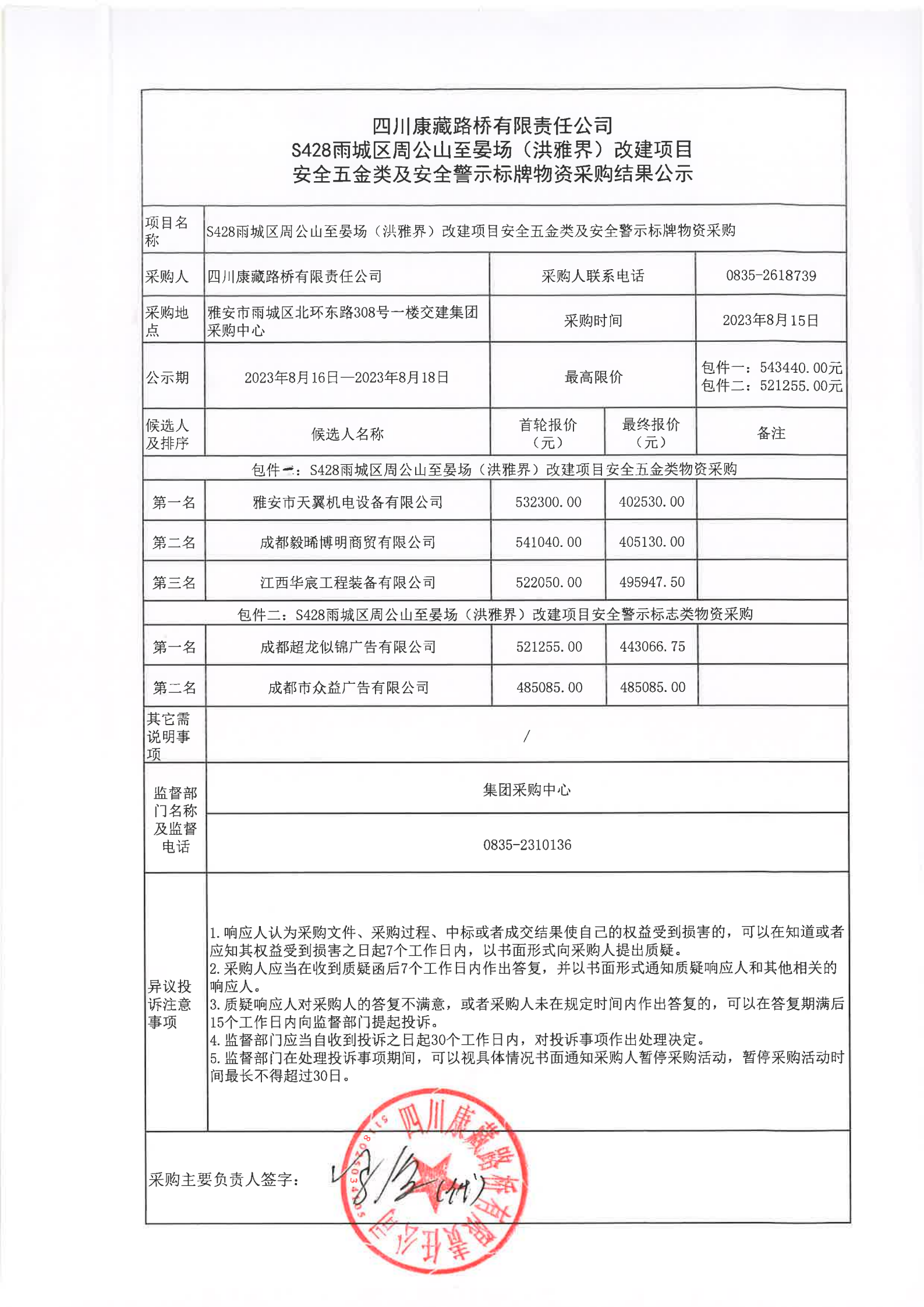 四川康藏路橋有限責任公司S428雨城區(qū)周公山至晏場(洪雅界)改建項目安全五金類及安全警示標牌物資采購結(jié)果公示