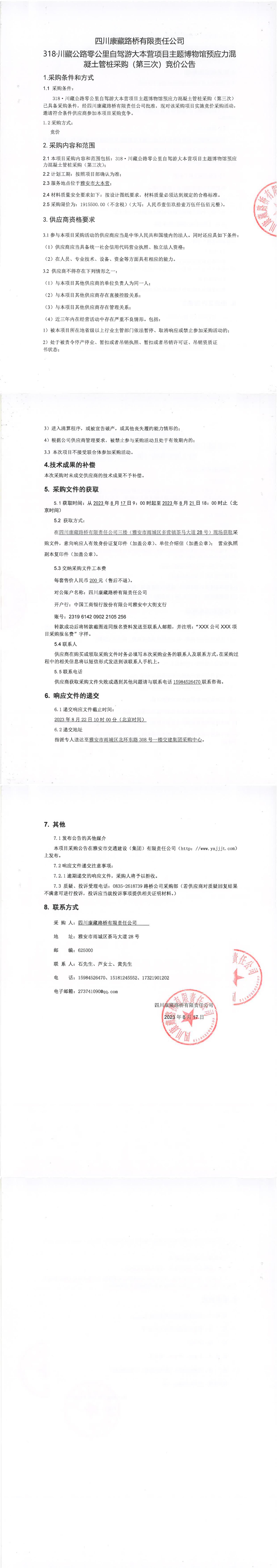 四川康藏路橋有限責(zé)任公司318·川藏公路零公里自駕游大本營項(xiàng)目主題博物館預(yù)應(yīng)力混凝土管樁采購(第三次)競價(jià)公告