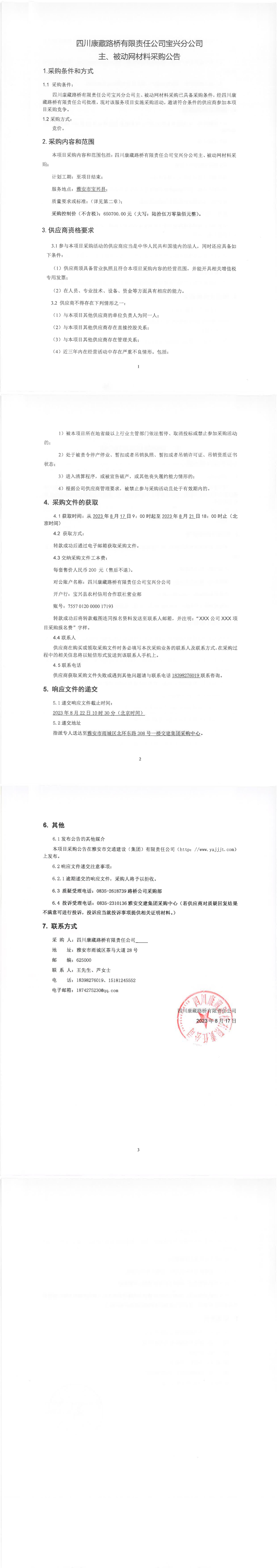 四川康藏路橋有限責(zé)任公司寶興分公司主、被動(dòng)網(wǎng)材料采購(gòu)公告