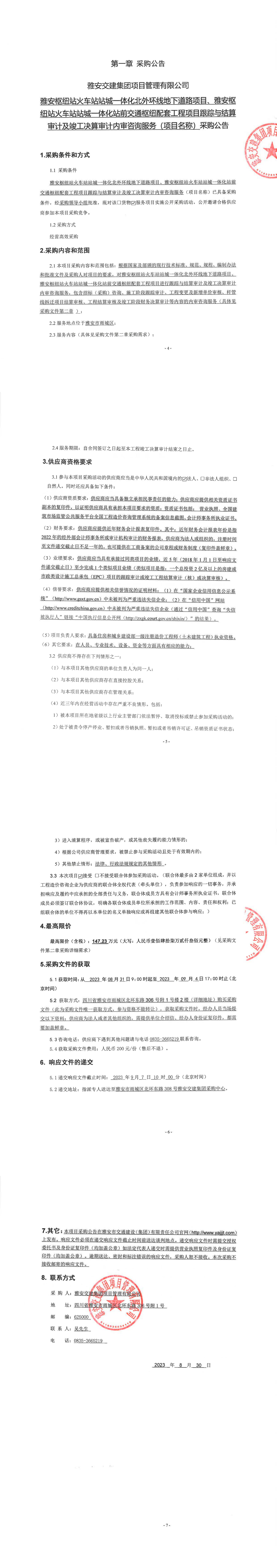 雅安交建集團(tuán)項(xiàng)目管理有限公司雅安樞紐站火車站站城一體化北外環(huán)線地下道路項(xiàng)目、樞紐站火車站站成一體化站前交通樞紐配套工程項(xiàng)目跟蹤與結(jié)算審計(jì)及竣工決算審計(jì)內(nèi)審咨詢服務(wù)(項(xiàng)目名稱)采購(gòu)公告
