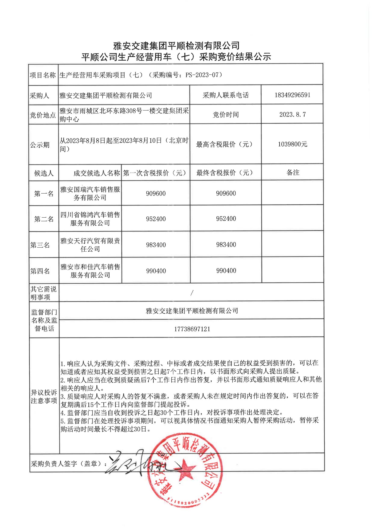 雅安交建集團平順檢測有限公司平順公司生產(chǎn)經(jīng)營用車(七)采購競價結(jié)果公示