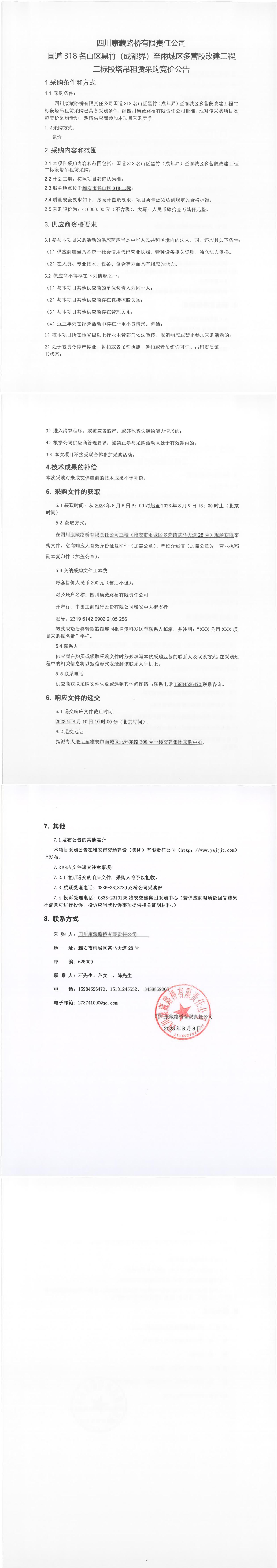 四川康藏路橋有限責(zé)任公司國道318名山區(qū)黑竹(成都界)至雨城區(qū)多營(yíng)段改建工程二標(biāo)段塔吊租賃采購競(jìng)價(jià)公告