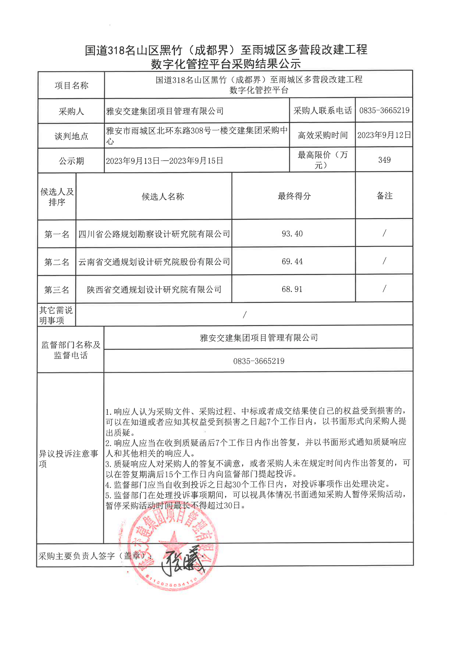雅安交建集團(tuán)項(xiàng)目管理有限公司國(guó)道318名山區(qū)黑竹(成都界)至雨城區(qū)多營(yíng)段改建工程數(shù)字化管控平臺(tái)采購結(jié)果公示
