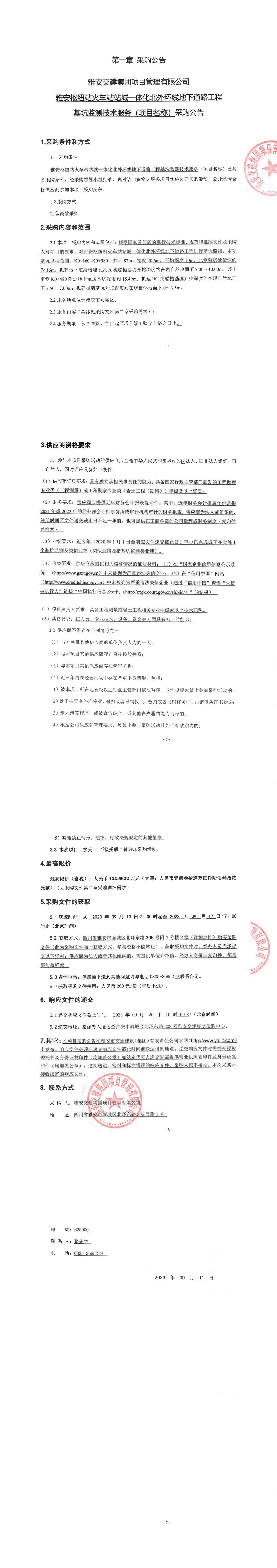 雅安交建集團(tuán)項目管理有限公司雅安樞紐站火車站站城一體化北外環(huán)線地下道路工程基坑監(jiān)測技術(shù)服務(wù)(項目名稱)采購公告