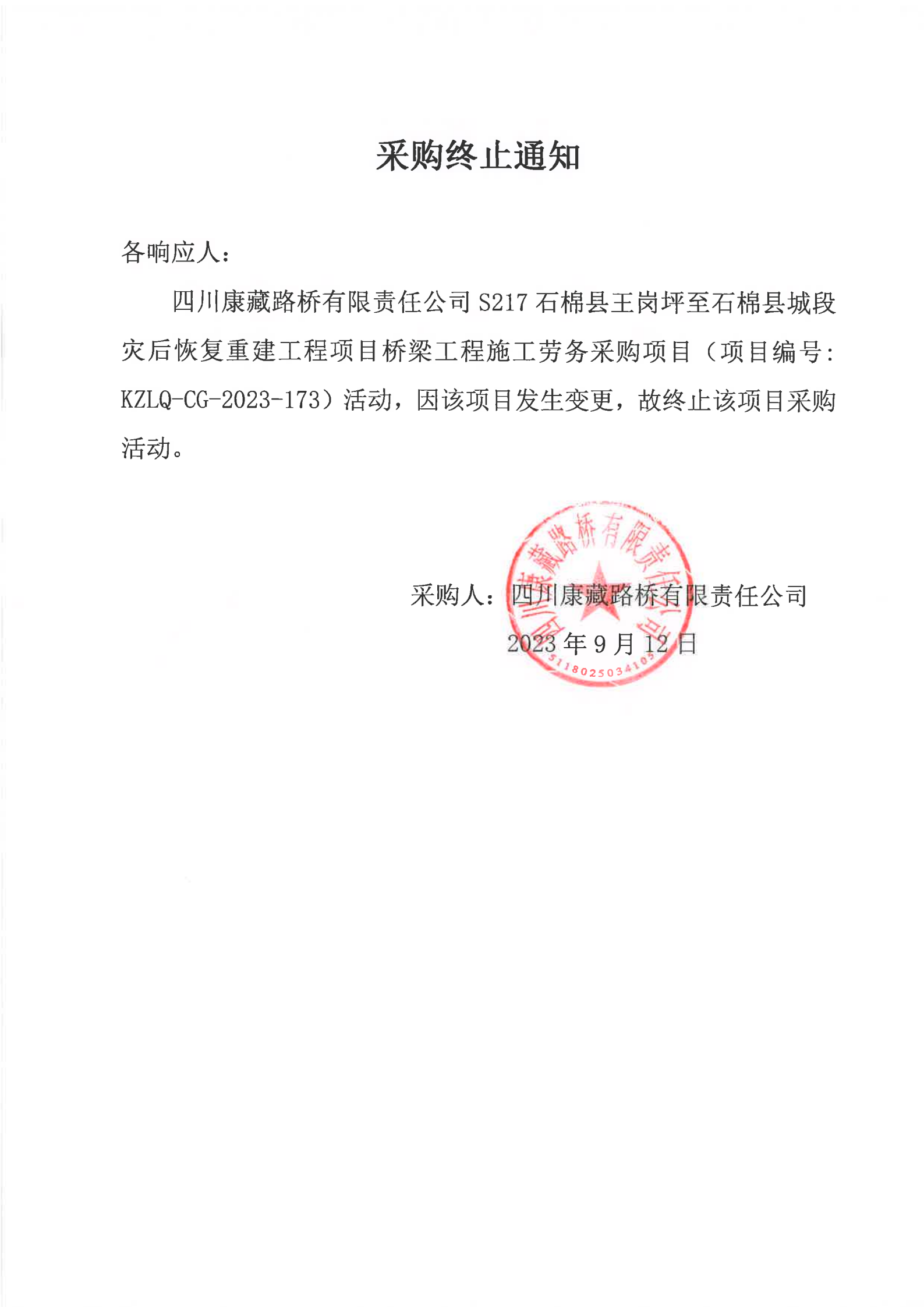 四川康藏路橋有限責任公司S217石棉縣王崗坪至石棉縣城段災(zāi)后恢復(fù)重建工程項目橋梁工程施工勞務(wù)項目采購終止通知