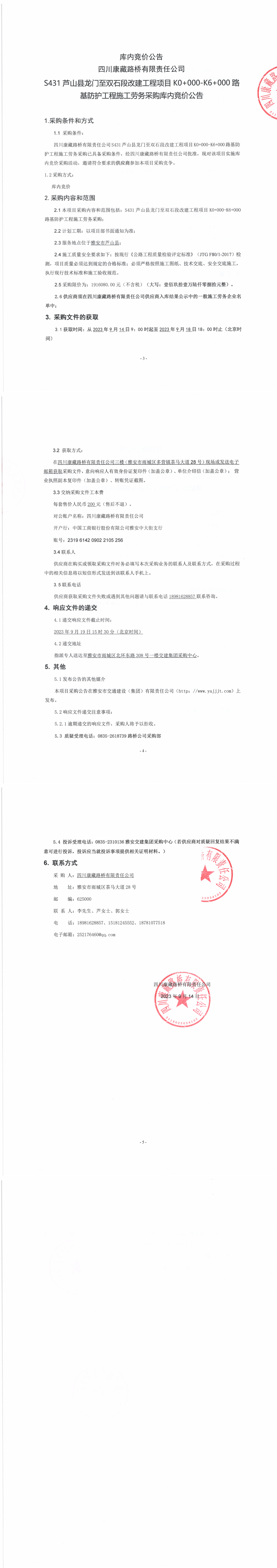 四川康藏路橋有限責(zé)任公司S431蘆山縣龍門(mén)至雙石段改建工程項(xiàng)目K0+000-K6+000路基防護(hù)工程施工勞務(wù)采購(gòu)公告