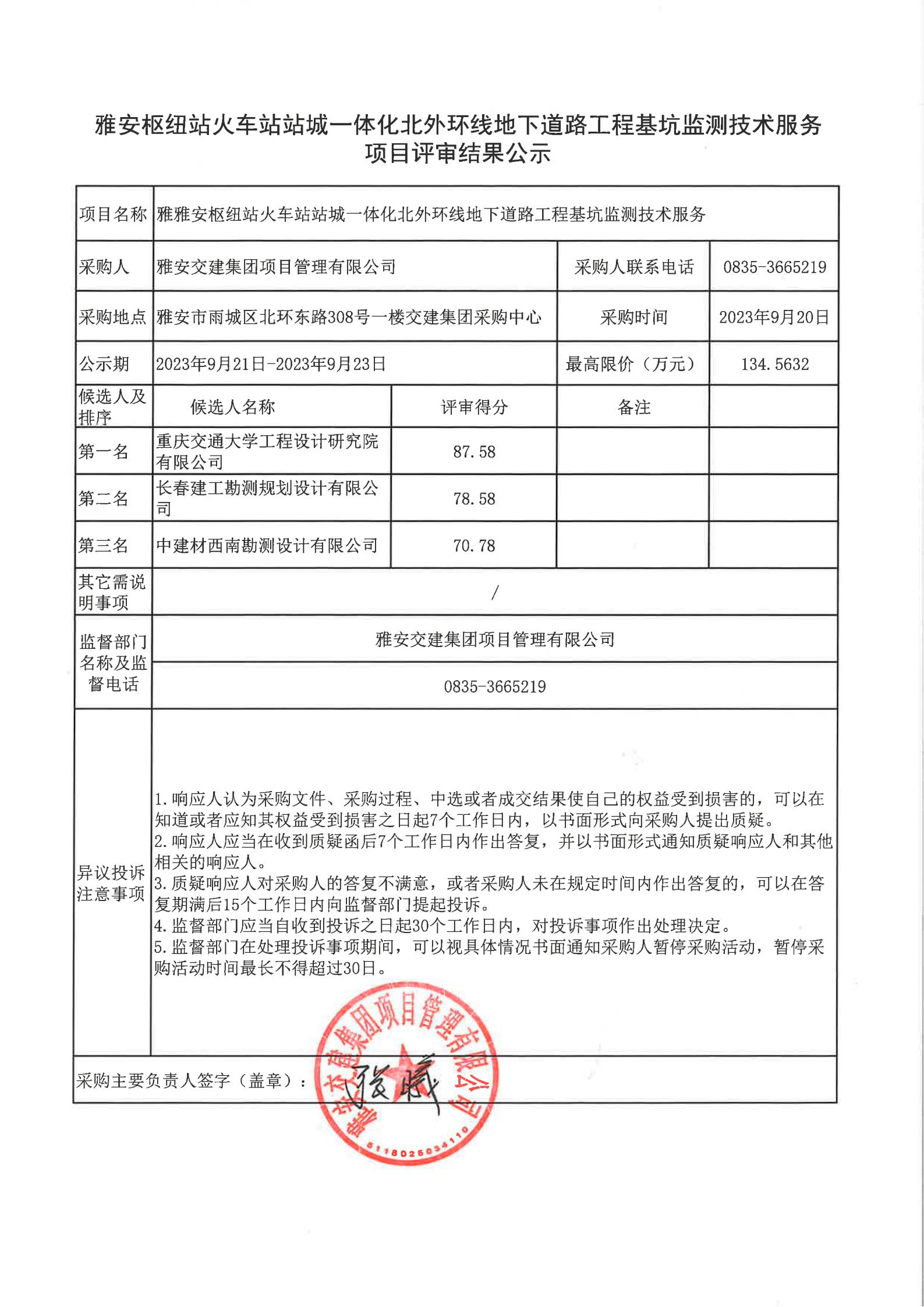 雅安交建集團(tuán)項(xiàng)目管理有限公司雅安樞紐站火車站站城一體化北外環(huán)線地下道路工程基坑監(jiān)測技術(shù)服務(wù)項(xiàng)目評審結(jié)果公示