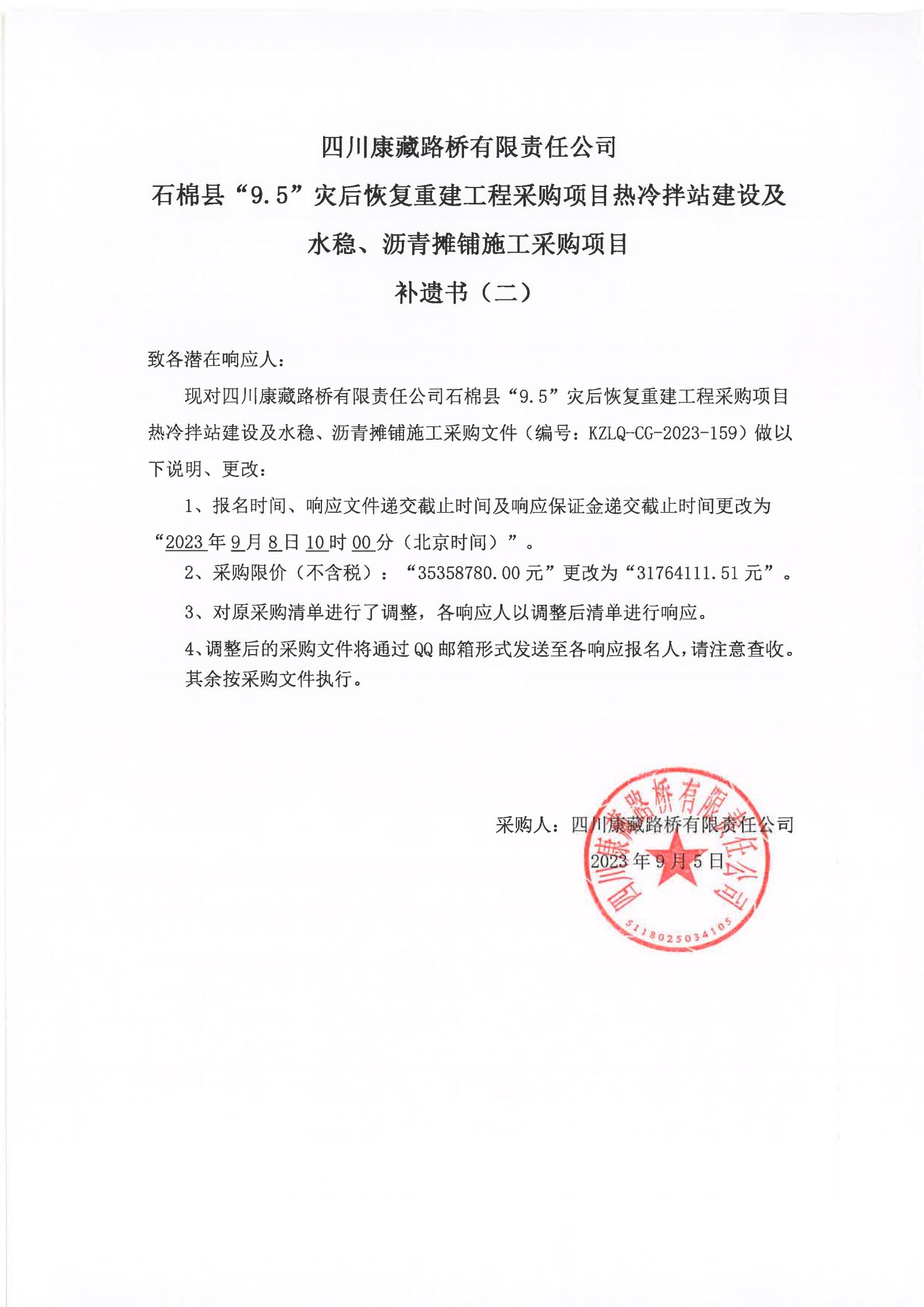 四川康藏路橋有限責(zé)任公司石棉縣“9·5”災(zāi)后恢復(fù)重建工程采購(gòu)項(xiàng)目熱冷拌站建設(shè)及水穩(wěn)、瀝青攤鋪施工采購(gòu)項(xiàng)目補(bǔ)遺書(二)