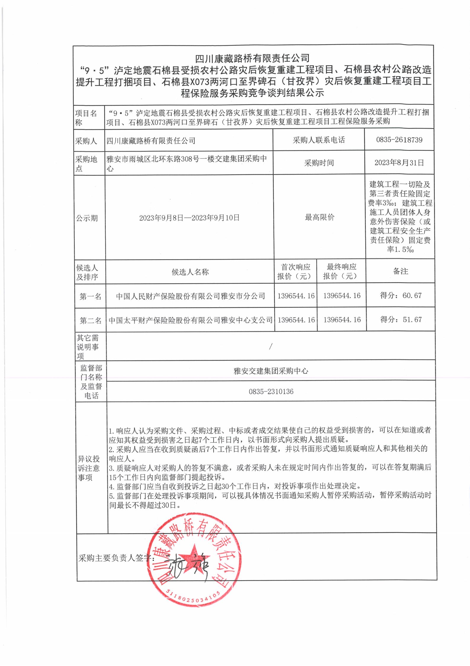 四川康藏路橋有限責任公司“9·5”瀘定地震石棉縣農(nóng)村公路災后恢復重建工程項目、石棉縣農(nóng)村公路改造提升工程打捆項目、石棉縣X073兩河口至界碑石(甘孜界)災后恢復重建工程項目工程保險服務采購競爭談判結果公示
