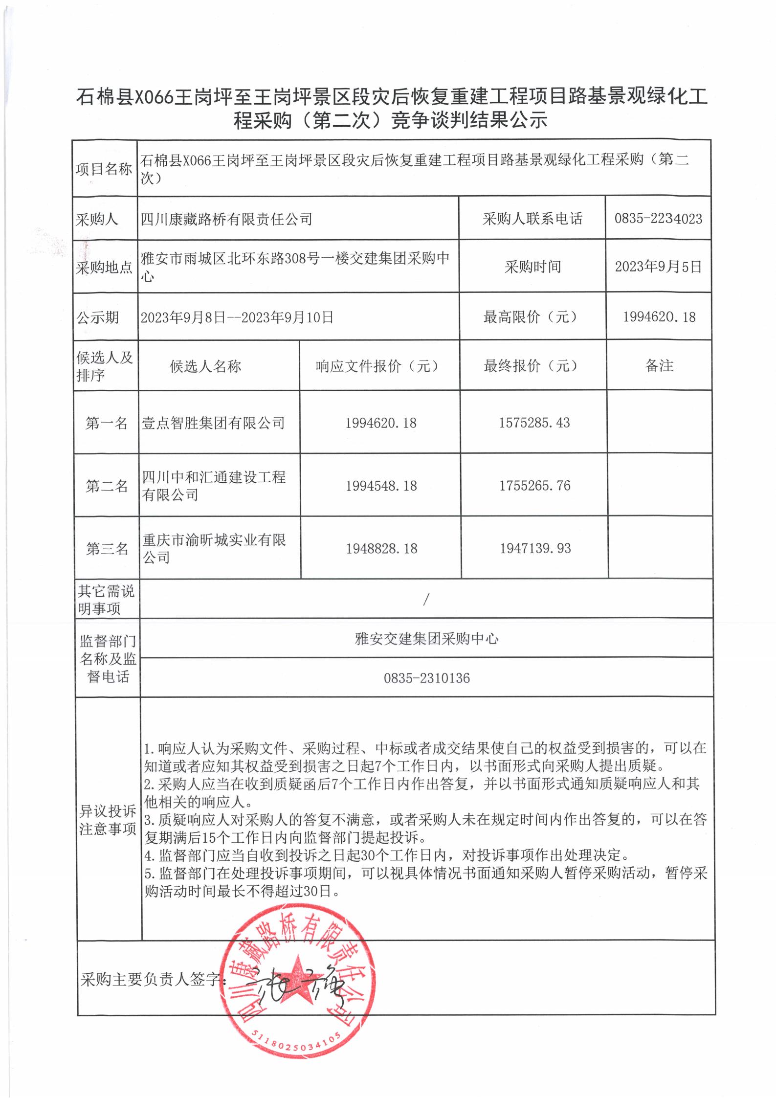 四川康藏路橋有限責任公司石棉縣X066王崗坪至王崗坪景區(qū)段災(zāi)后恢復重建工程項目路基景觀綠化工程施工采購(第二次)競爭談判結(jié)果公示
