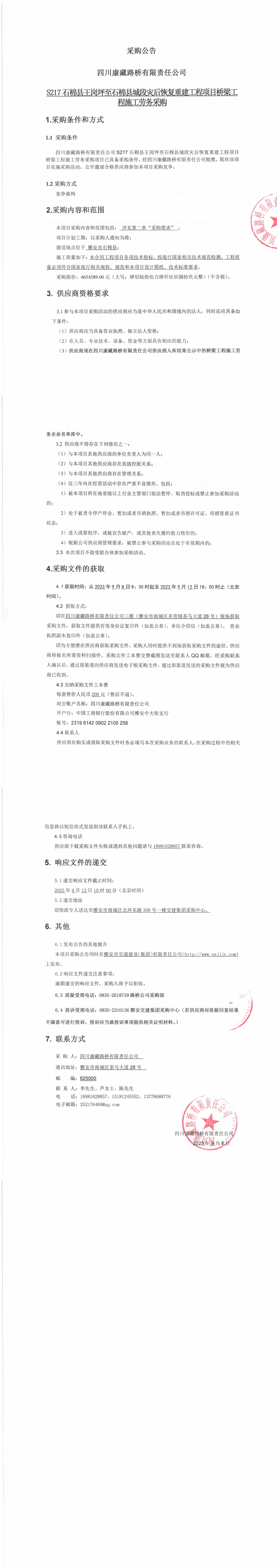 四川康藏路橋有限責(zé)任公司S217石棉縣王崗坪至石棉縣城段災(zāi)后恢復(fù)重建工程項(xiàng)目橋梁工程施工勞務(wù)采購(gòu)公告