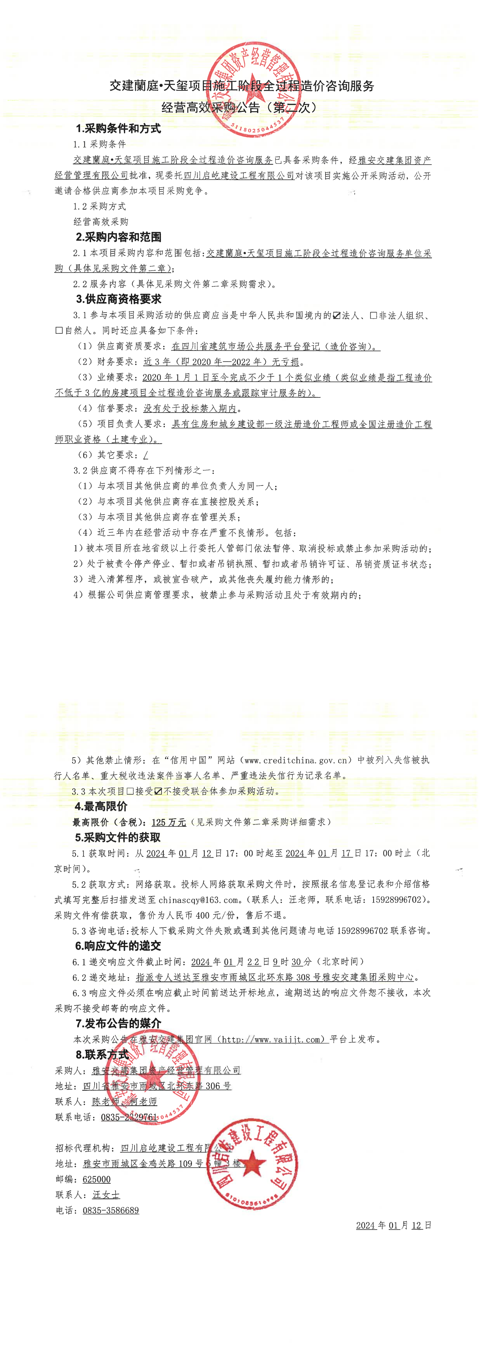 雅安交建集團資產(chǎn)經(jīng)營管理有限公司交建蘭庭·天璽項目施工階段全過程造價咨詢服務(wù)經(jīng)營高效采購公告(第二次)
