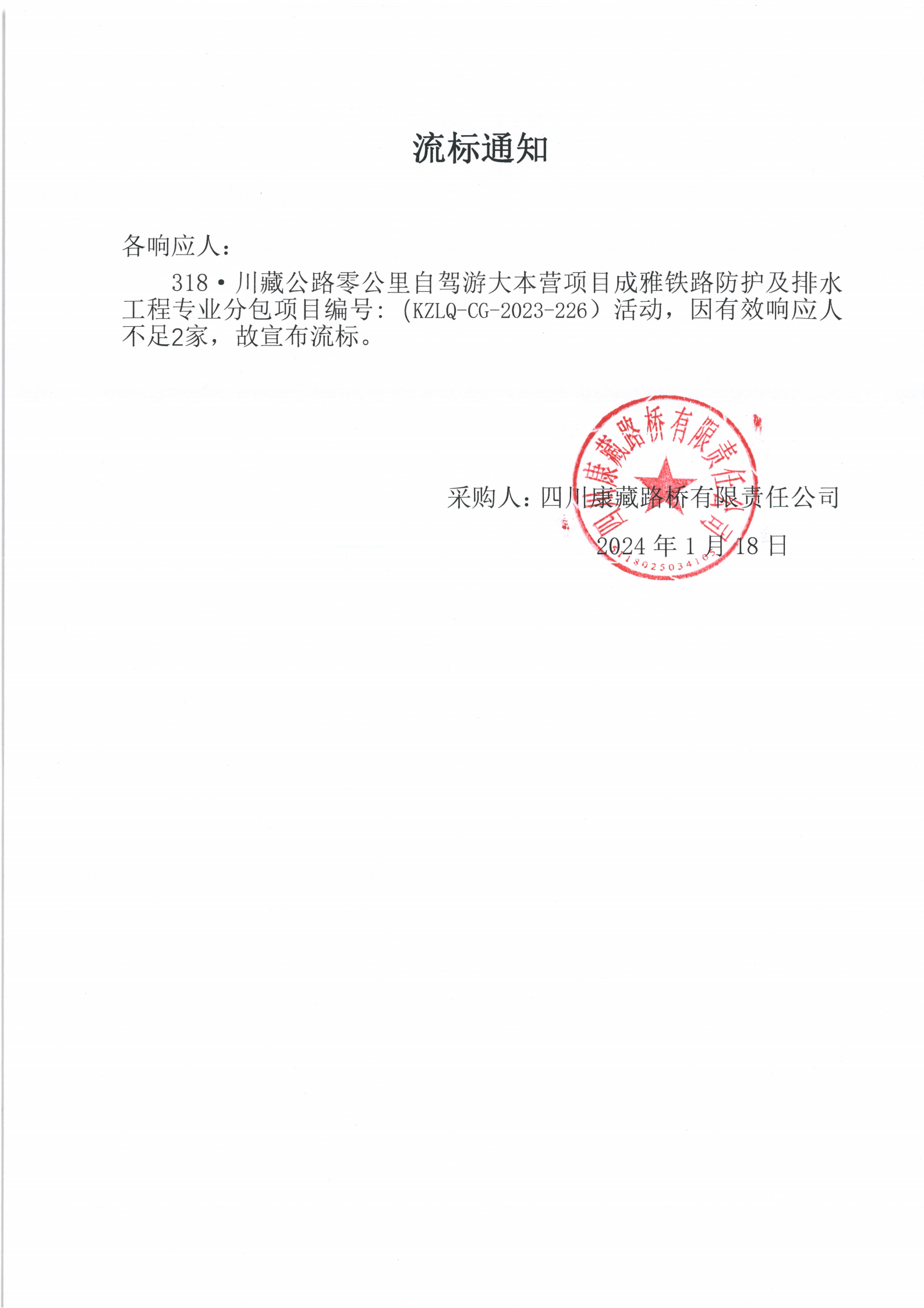 四川康藏路橋有限責任公司318·川藏公路零公里自駕游大本營項目成雅鐵路防護及排水工程專業(yè)分包項目流標通知