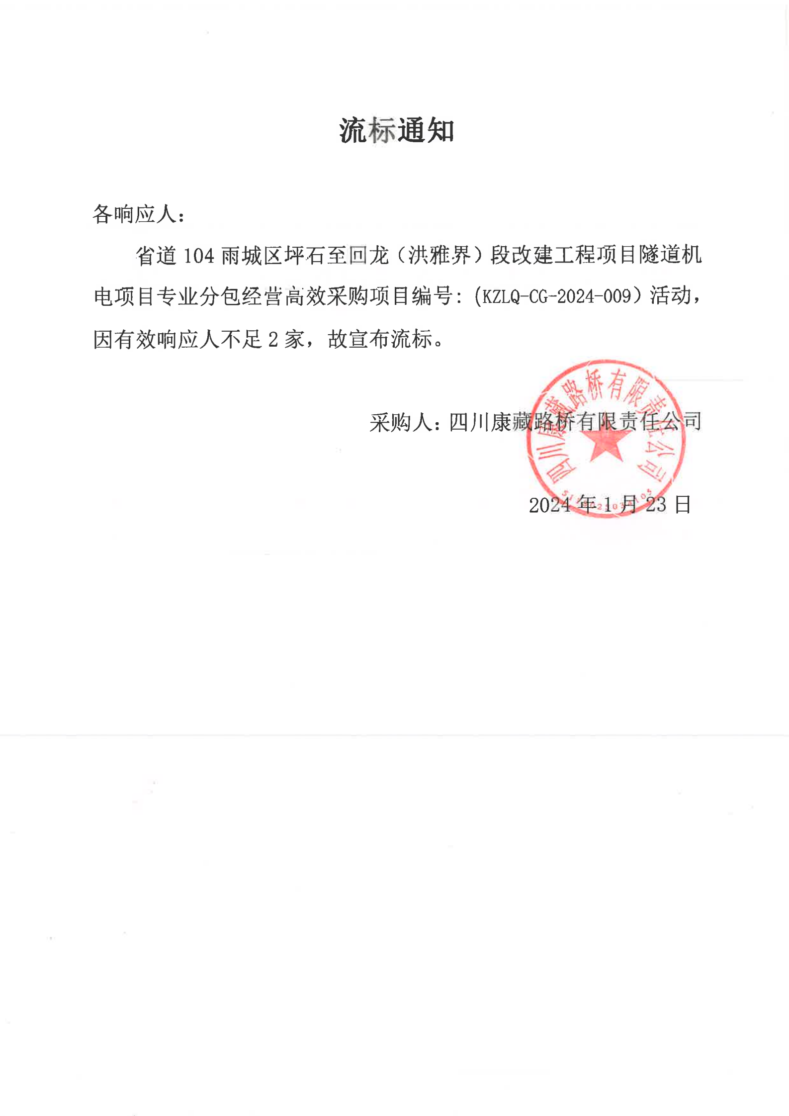 四川康藏路橋有限責(zé)任公司省道104雨城區(qū)坪石至回龍(洪雅界)段改建工程項(xiàng)目隧道機(jī)電項(xiàng)目專(zhuān)業(yè)分包經(jīng)營(yíng)高效采購(gòu)流標(biāo)通知