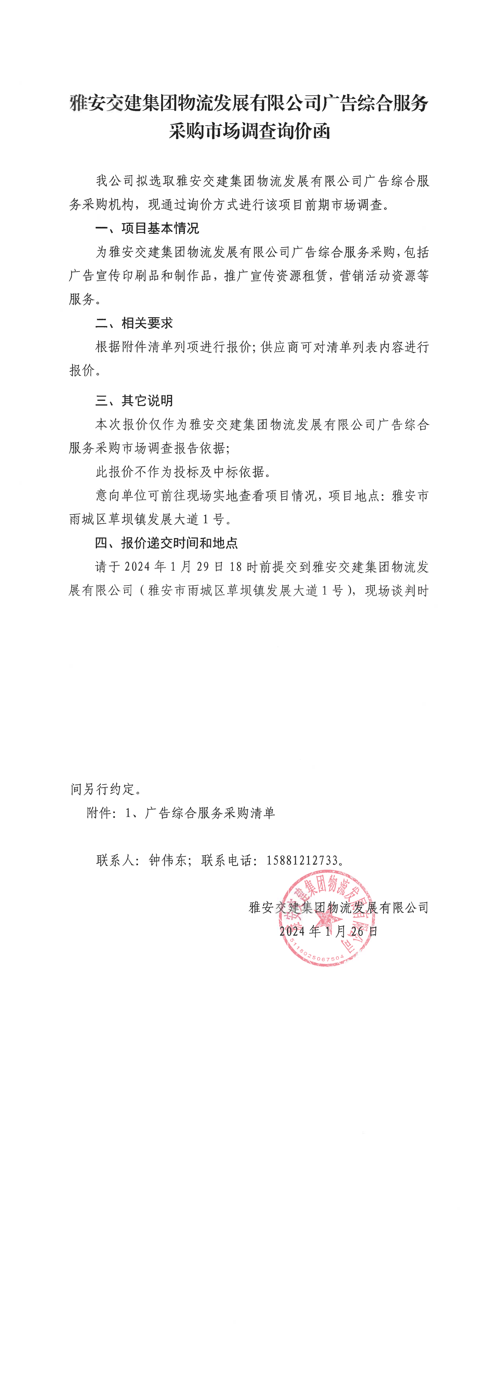 雅安交建集團物流發(fā)展有限公司廣告綜合服務采購市場調(diào)查詢價函