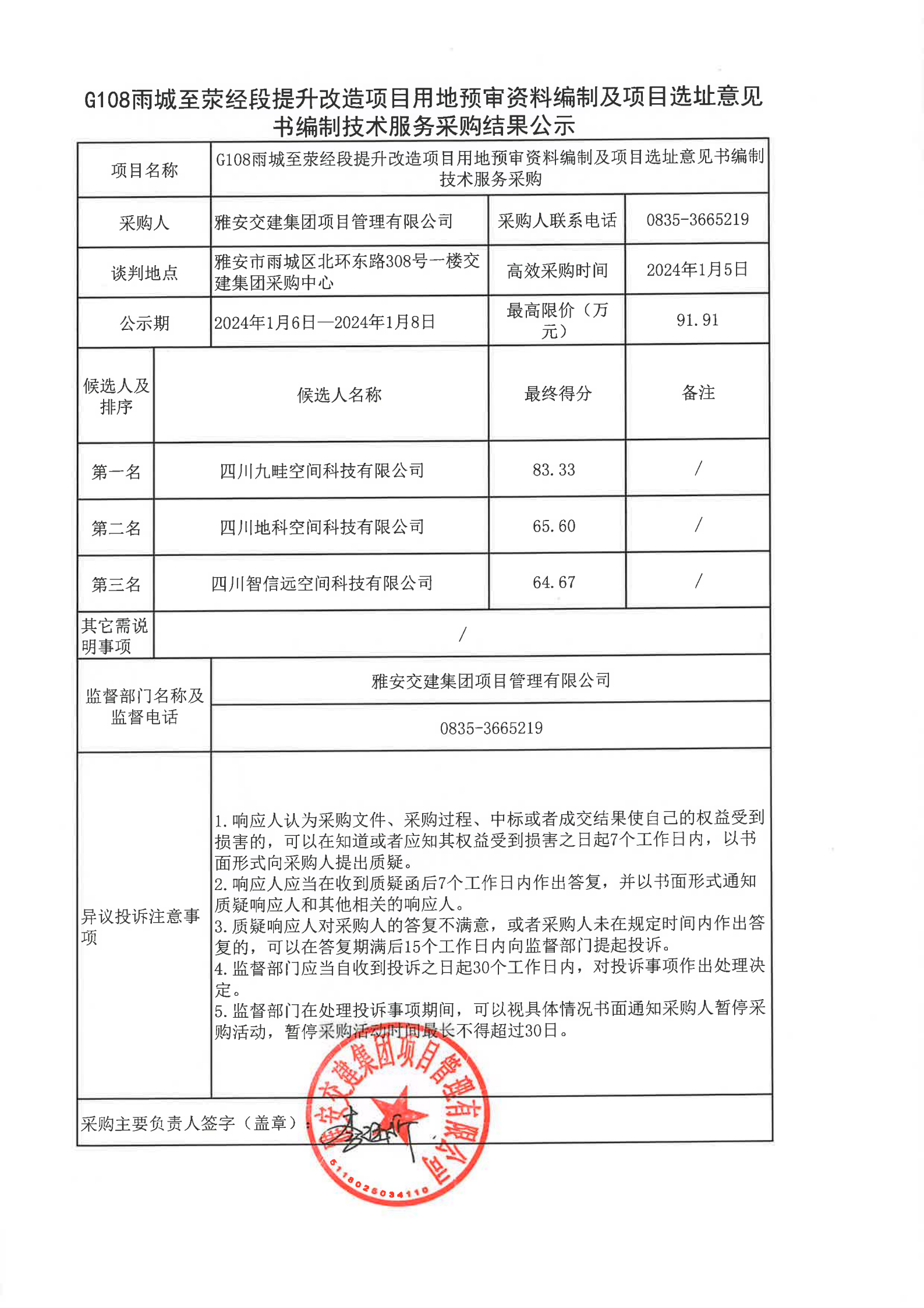 雅安交建集團(tuán)項(xiàng)目管理有限公司G108雨城至滎經(jīng)段提升改造項(xiàng)目用地預(yù)審資料編制及項(xiàng)目選址意見(jiàn)書(shū)編制技術(shù)服務(wù)采購(gòu)結(jié)果公示