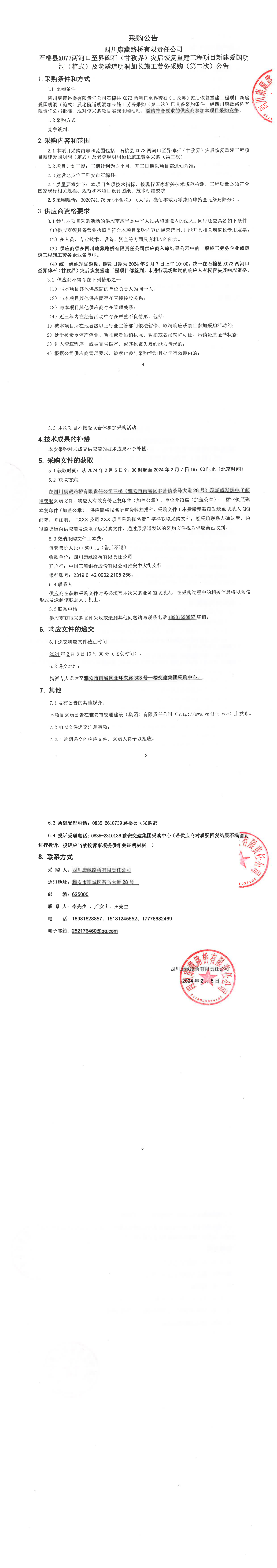四川康藏路橋有限責(zé)任公司石棉縣X073兩河口至界碑石(甘孜界)災(zāi)后恢復(fù)重建工程項(xiàng)目新建愛(ài)國(guó)明洞(箱式)及老隧道明洞加長(zhǎng)施工勞務(wù)采購(gòu)(第二次)公告