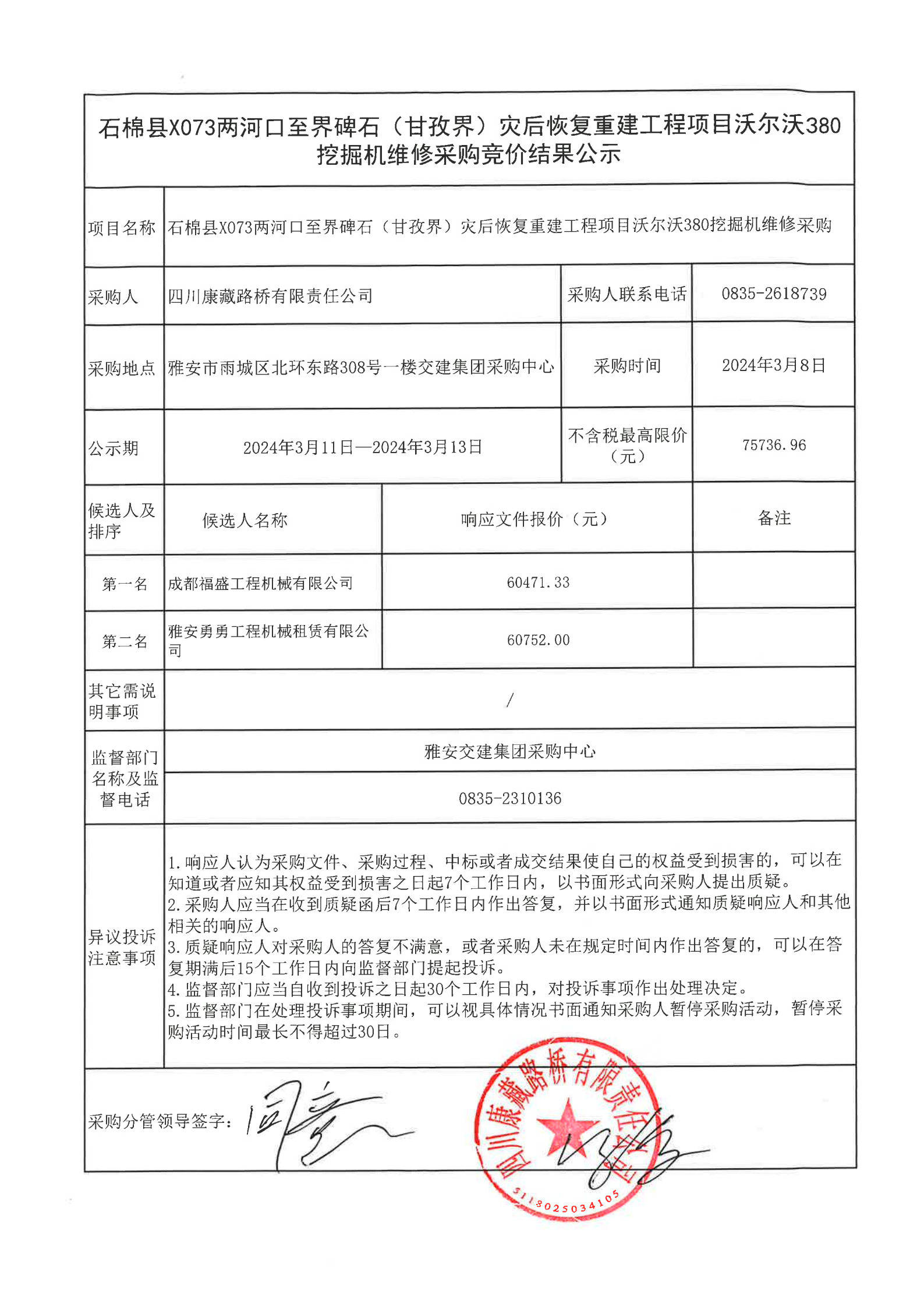 四川康藏路橋有限責(zé)任公司石棉縣X073兩河口至界碑石(甘孜界)災(zāi)后恢復(fù)重建工程項(xiàng)目沃爾沃380挖掘機(jī)維修采購競(jìng)價(jià)結(jié)果公示