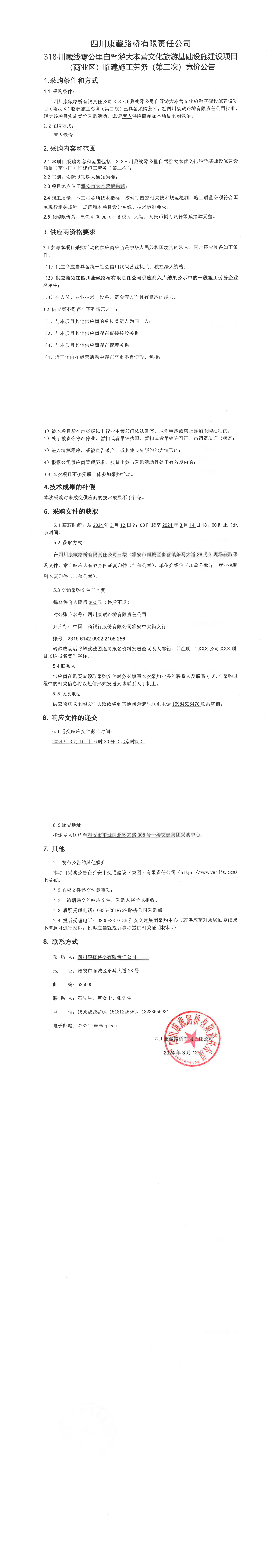 四川康藏路橋有限責任公司318·川藏公路零公里自駕游大本營文化旅游基礎(chǔ)設(shè)施建設(shè)項目(商業(yè)區(qū))臨建施工勞務(第二次)競價公告