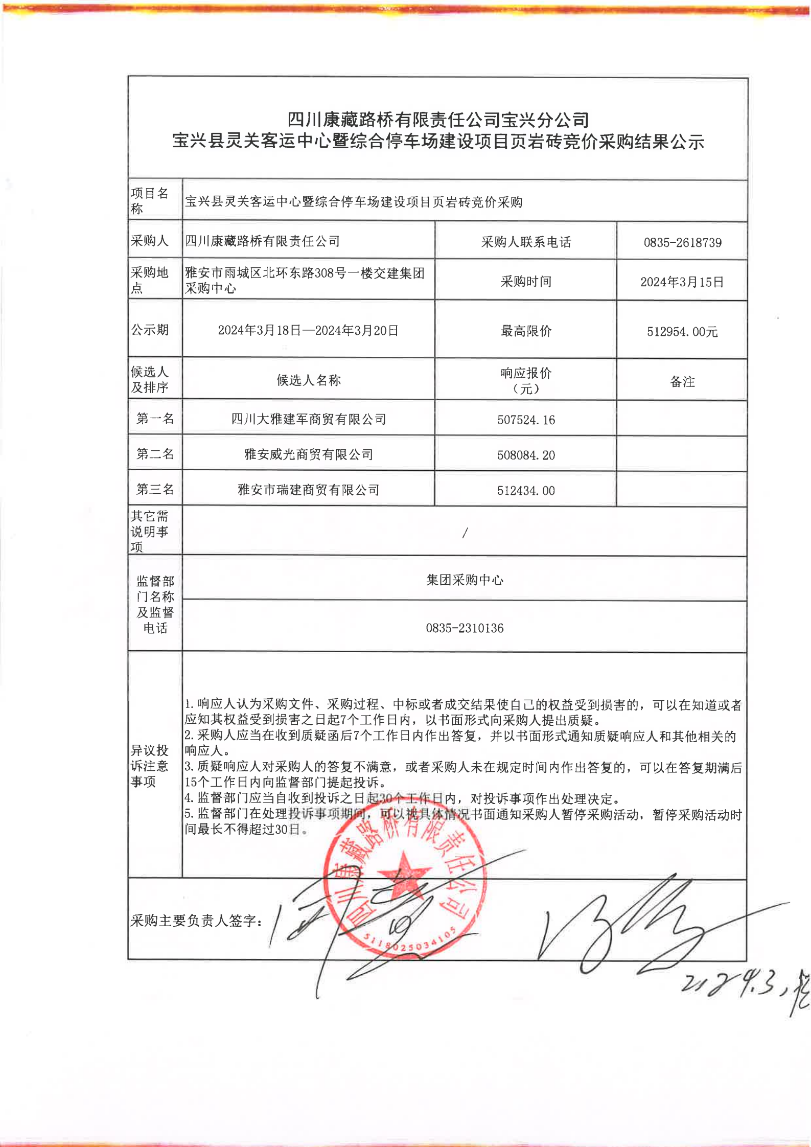四川康藏路橋有限責(zé)任公司寶興分公司寶興縣靈關(guān)客運(yùn)中心暨綜合停車場建設(shè)項(xiàng)目頁巖磚競價(jià)采購結(jié)果公示