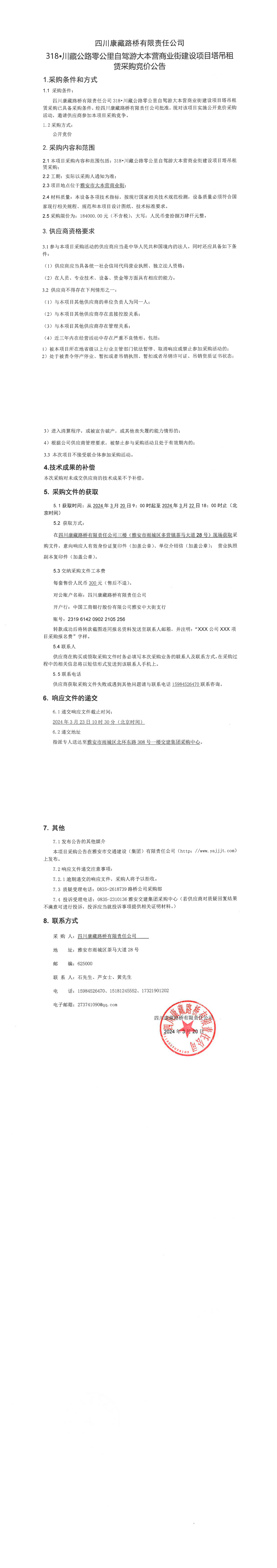 四川康藏路橋有限責任公司318·川藏公路零公里自駕游大本營商業(yè)街建設(shè)項目塔吊租賃采購競價公告