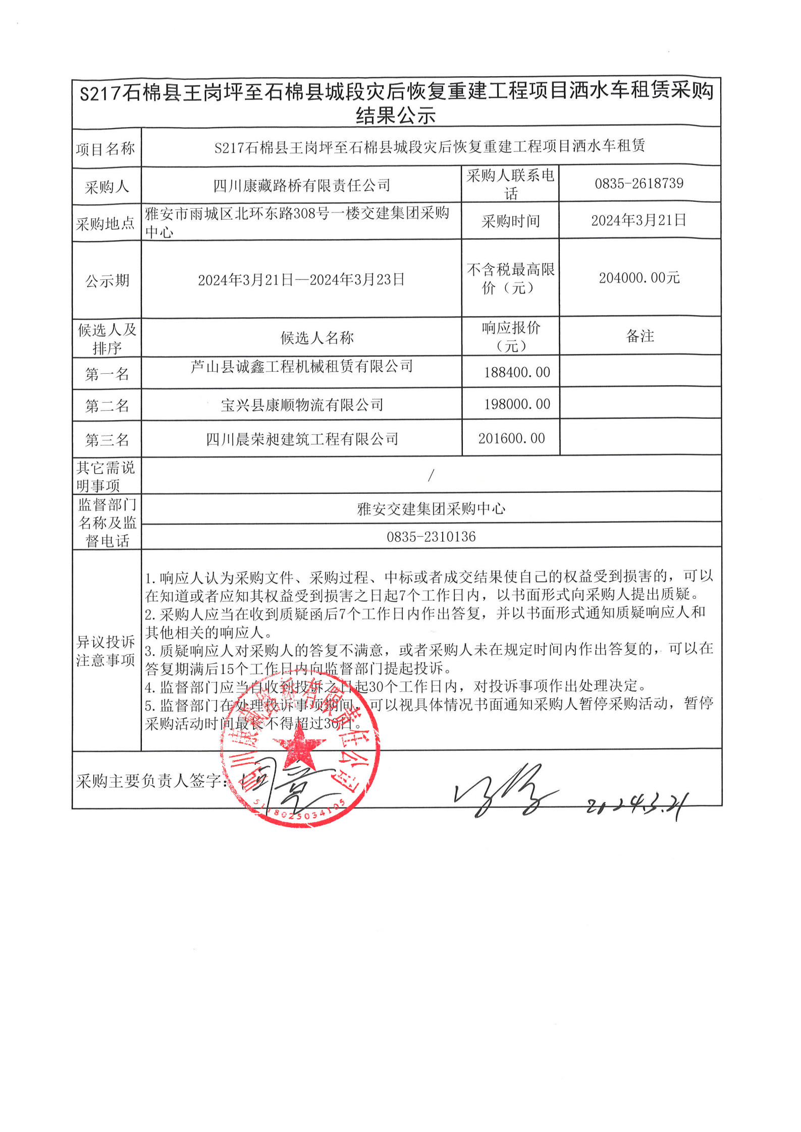 四川康藏路橋有限責(zé)任公司S217石棉縣王崗坪至石棉縣城段災(zāi)后恢復(fù)重建工程項(xiàng)目灑水車(chē)租賃采購(gòu)結(jié)果公示