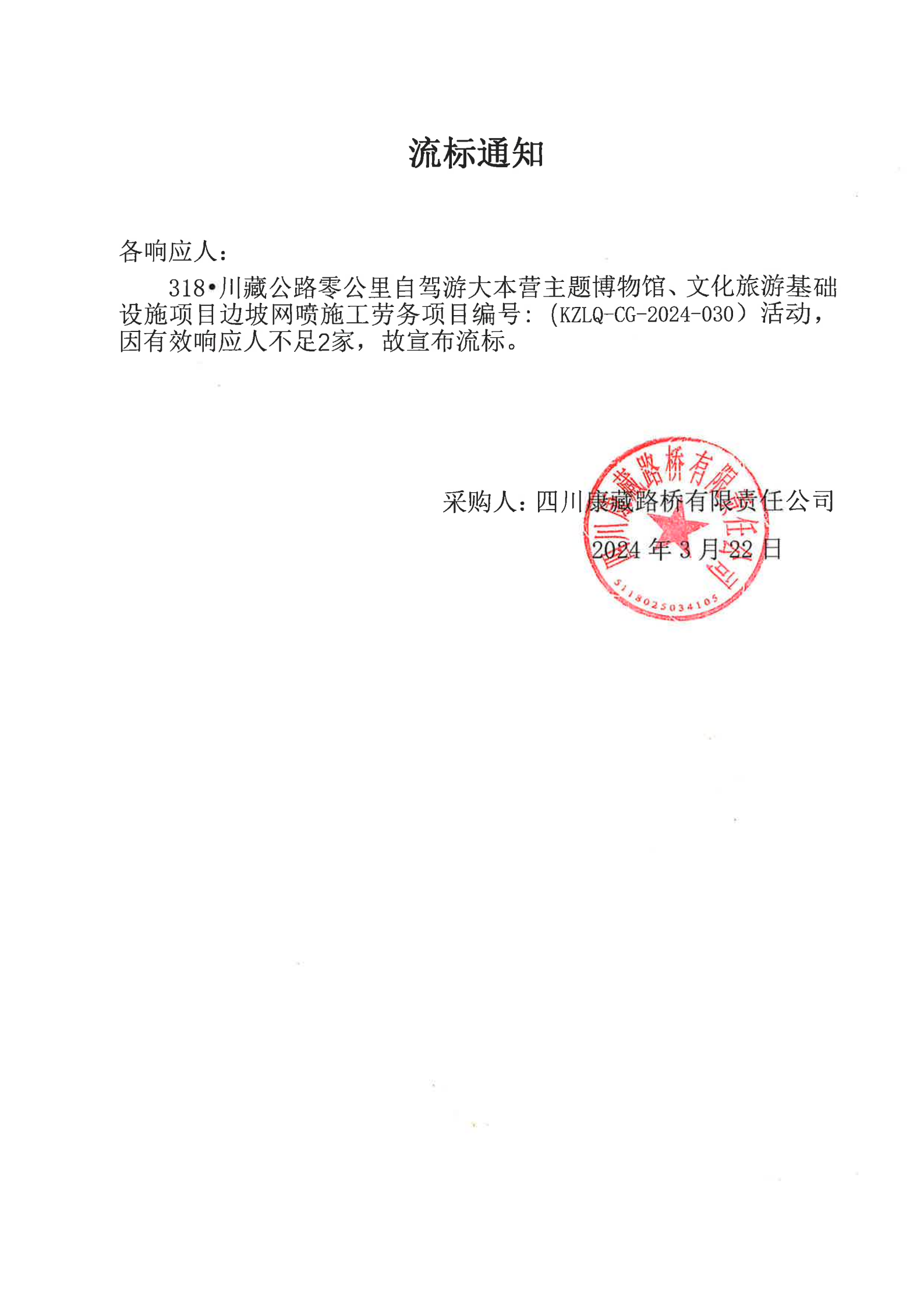 四川康藏路橋有限責(zé)任公司318·川藏公路零公里自駕游大本營主題博物館、文化旅游基礎(chǔ)設(shè)施項(xiàng)目邊坡網(wǎng)噴施工勞務(wù)流標(biāo)通知