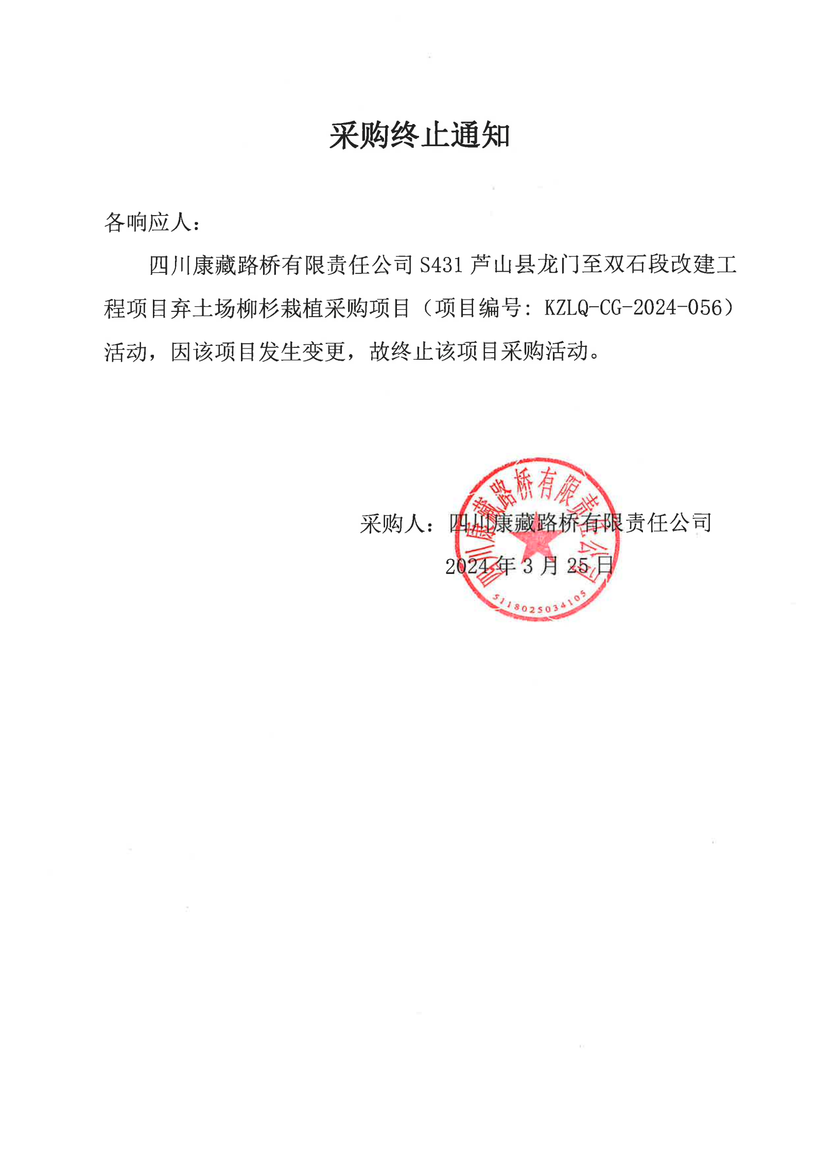 四川康藏路橋有限責(zé)任公司S431蘆山縣龍門鎮(zhèn)至雙石段改建工程項(xiàng)目棄土場柳杉載植采購終止通知