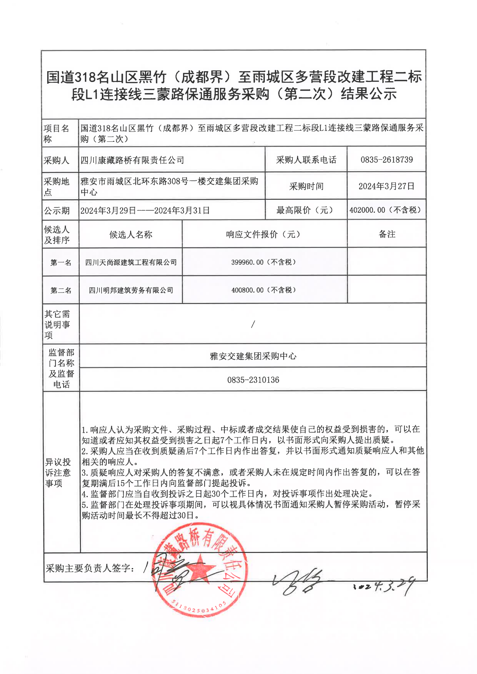 四川康藏路橋有限責(zé)任公司國(guó)道318名山區(qū)黑竹(成都界)至雨城區(qū)多營(yíng)段改建工程二標(biāo)段L1連接線三蒙路保通服務(wù)(第二次)結(jié)果公示