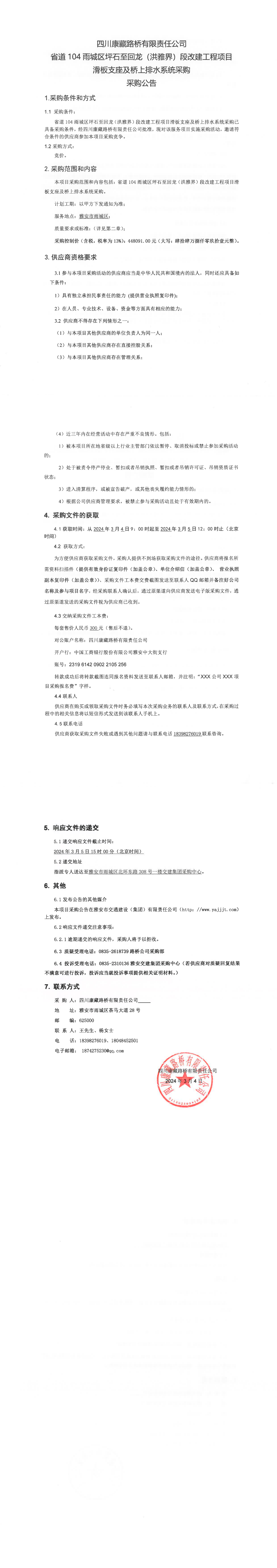 四川康藏路橋有限責(zé)任公司省道104雨城區(qū)坪石至回龍(洪雅界)段改建工程項(xiàng)目滑板支座及橋上排水系統(tǒng)采購(gòu)公告