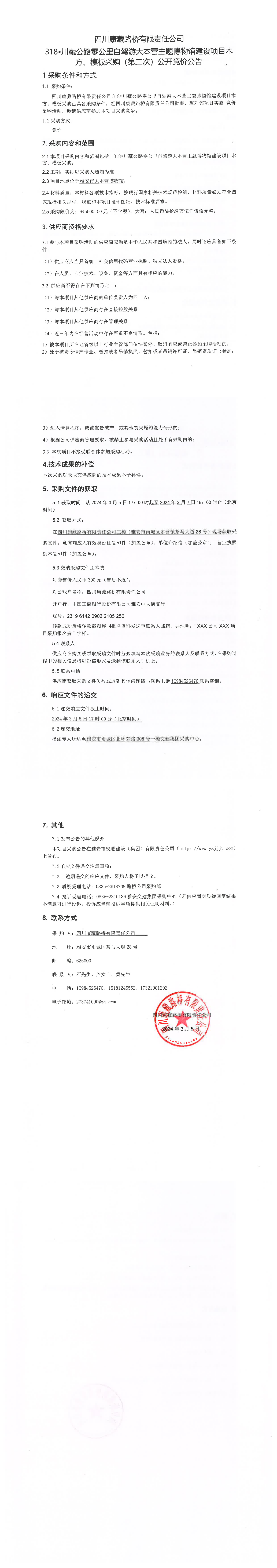 四川康藏路橋有限責(zé)任公司318·川藏公路零公里自駕游大本營(yíng)主題博物館建設(shè)項(xiàng)目木方、模板采購(第二次)公開競(jìng)價(jià)公告