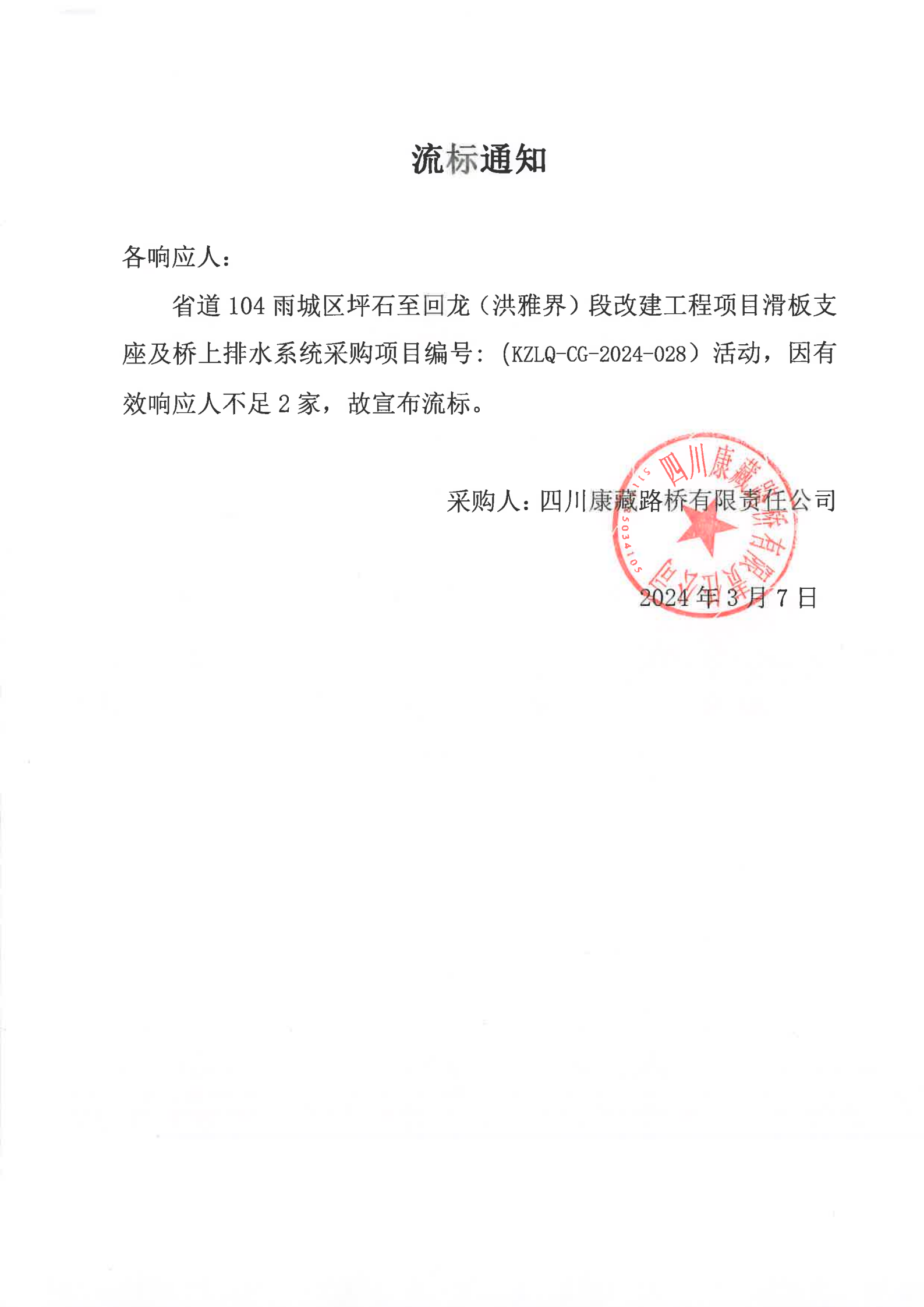 四川康藏路橋有限責(zé)任公司省道104雨城區(qū)坪石至回龍(洪雅界)段改建工程項(xiàng)目滑板支座及橋上排水系統(tǒng)流采購標(biāo)通知