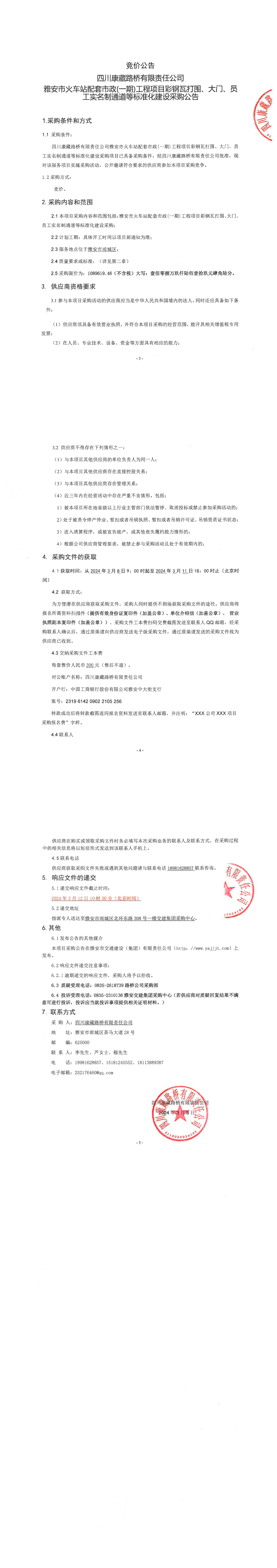四川康藏路橋有限責(zé)任公司雅安市火車站配套市政(一期)工程項(xiàng)目彩鋼瓦打圍、大門、員工實(shí)名制通道等標(biāo)準(zhǔn)化建設(shè)采購(gòu)公告