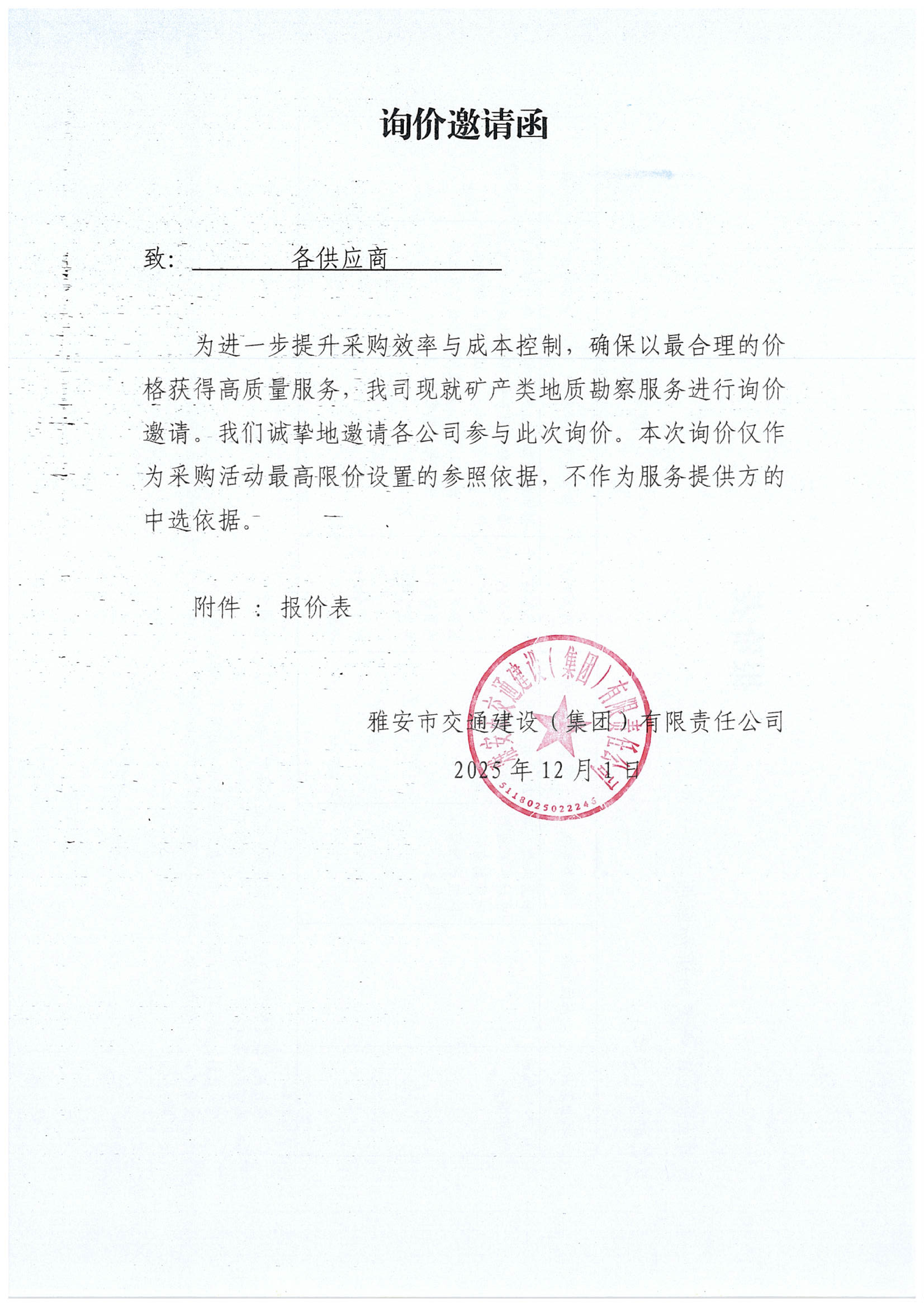 關(guān)于雅安市交通建設(shè)(集團(tuán))有限責(zé)任公司礦產(chǎn)類地質(zhì)勘察服務(wù)限價(jià)的詢價(jià)函